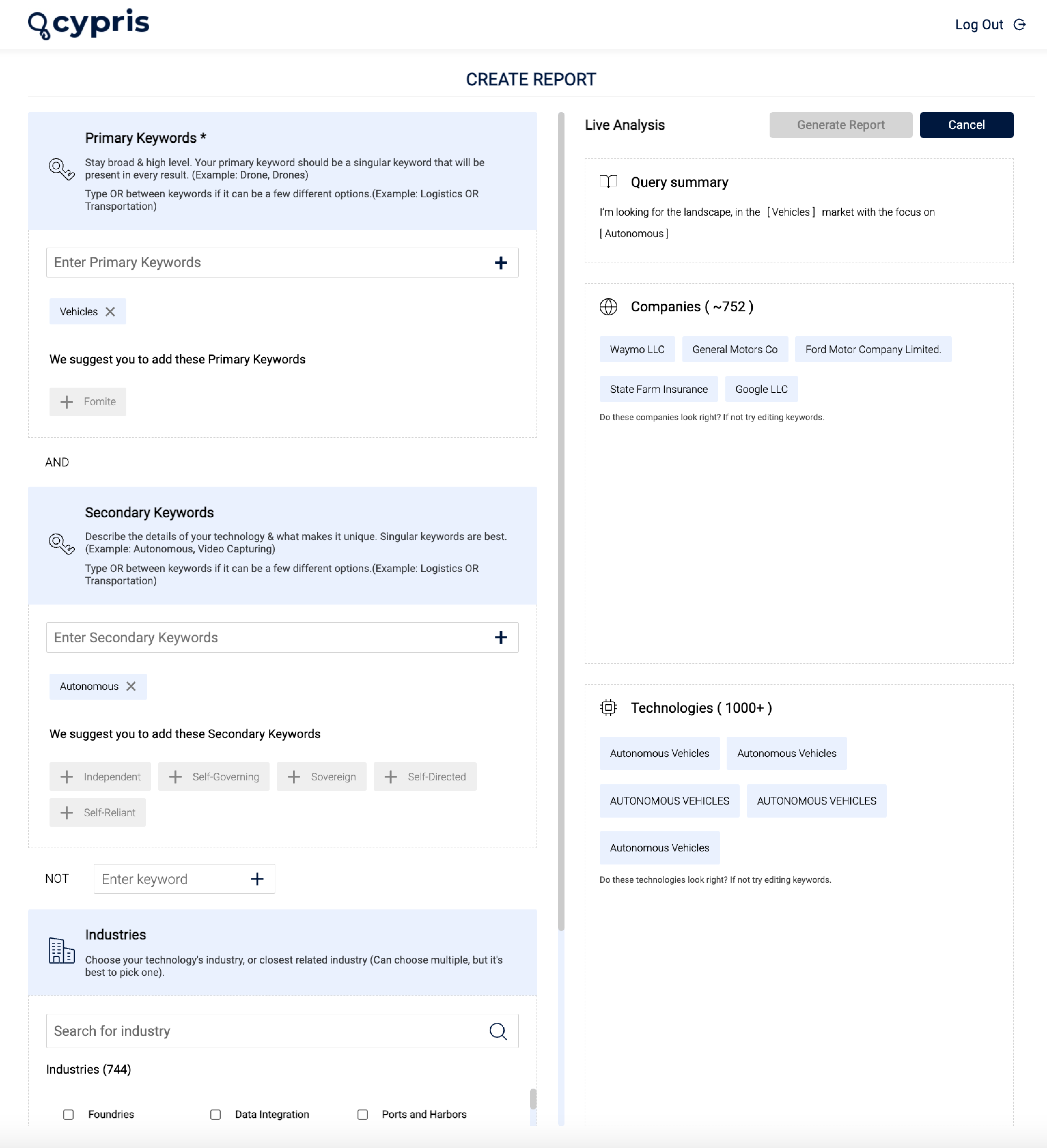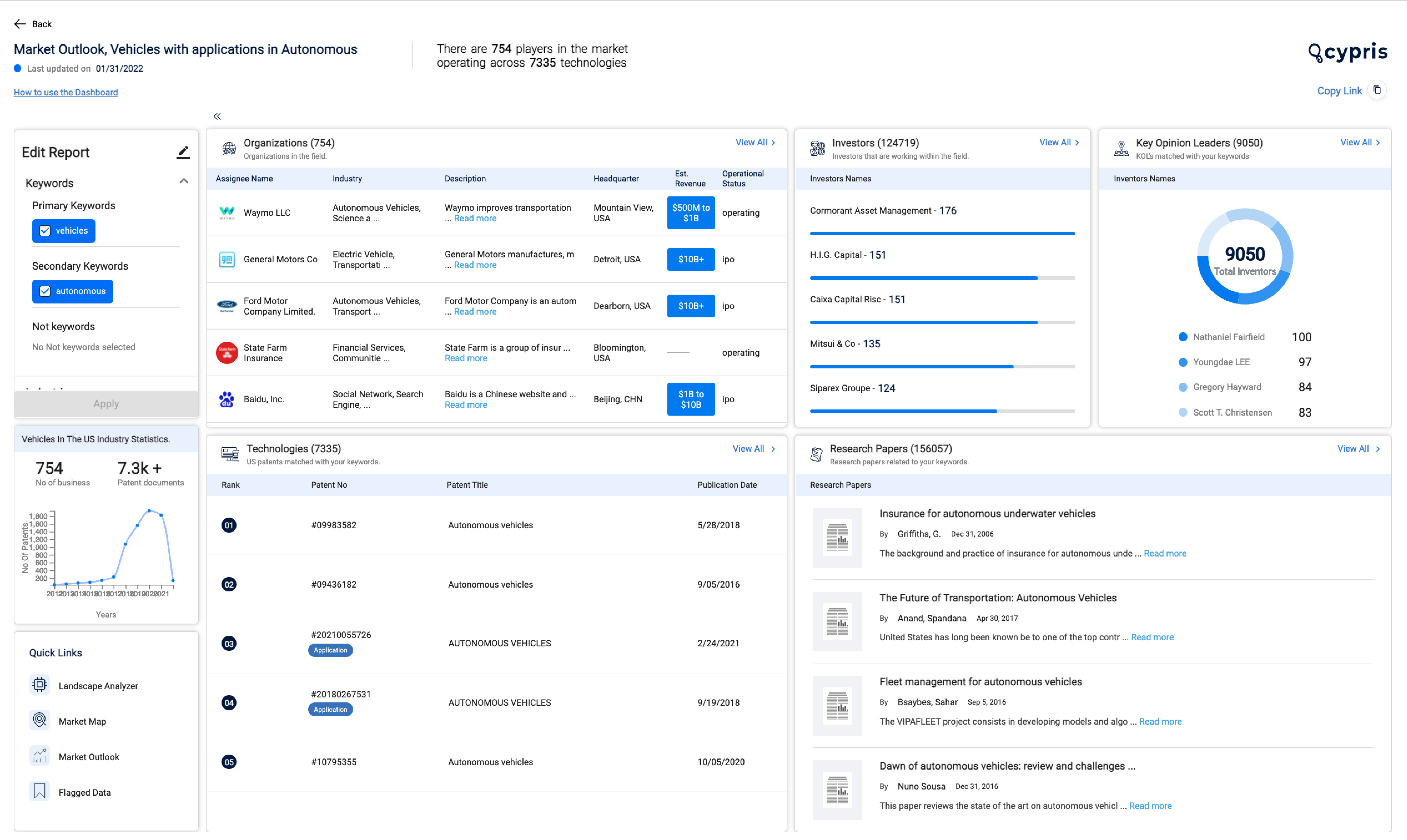 Soon after my patent was issued, I needed broader markets confirmation before moving forward with the idea. First off could a company add it to their Portfolio or buy it from me? This is the larger scenario of patent investment since Patents could potentially conflict. I was contacted by Cypris describing the benefits that the Market Intelligence report would give me. Shortly after agreeing and receiving the report I was impressed with how many competitor patents were generated in the report. There were patents I hadn't seen in my google searches that I performed previously. Also impressive are the list of companies that are the potential to manufacture the invention along with the extensive list of contacts that you can click to connect with. In Summary, I should have requested the report before I filed for the patent but for the low cost of the report it was a no brainer for me to have it completed. Review collected by and hosted on G2.com.