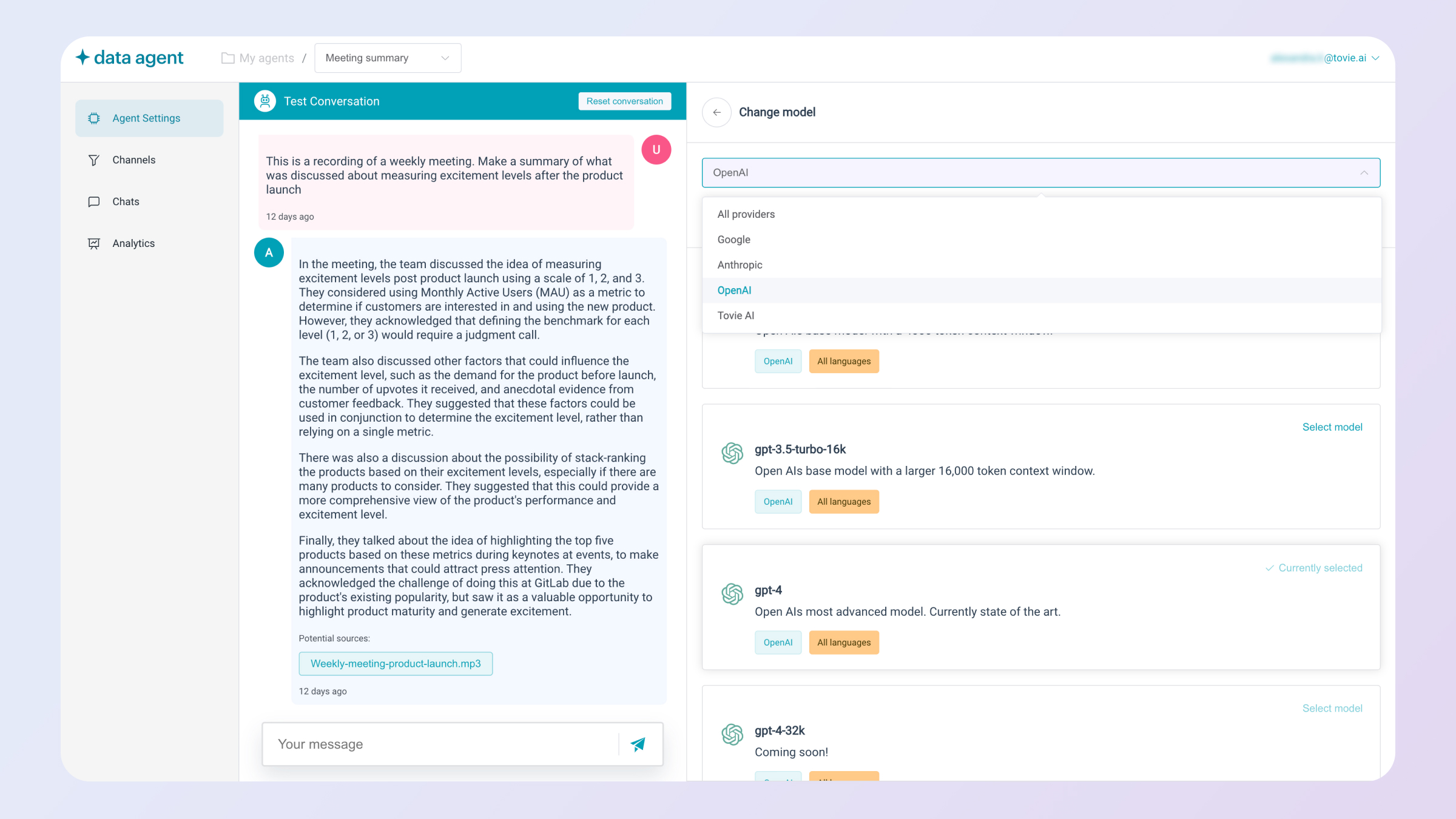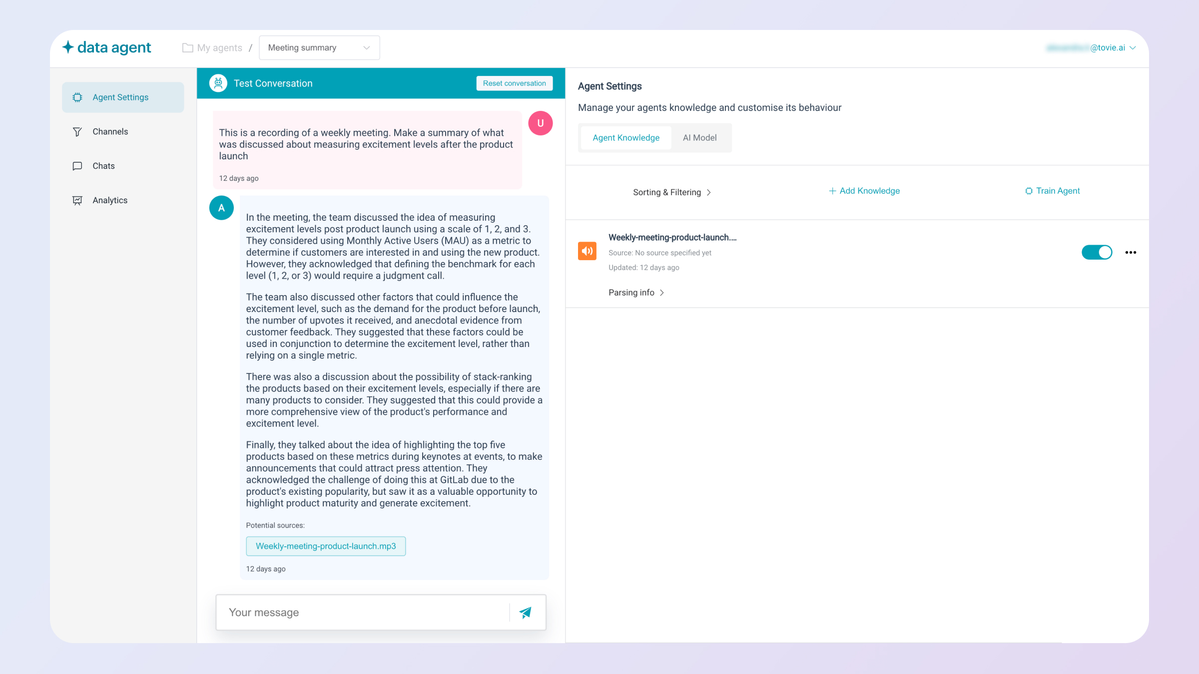 Fin’s AI Agent System gives you complete control with four core capabilities, analyze, train, test, and deploy, all in one easy-to-use workspace. It’s designed to fine-tune quality and drive continuous performance improvement. No code required. Train: Teach Fin with your knowledge, data, policies, and tone of voice. It delivers accurate, consistent answers and handles complex tasks in more than 45 languages. Test: Use real customer questions to check answer quality. Simulate different audiences and refine sources and settings so Fin always reflects your brand and policies. Deploy: Launch Fin across email, voice, live chat, social, and more. It can answer, triage, and collaborate with your team to provide a consistent experience everywhere. Analyze: Monitor and optimize Fin’s performance across AI and human service. Spot issues, fill content gaps, and improve service quality with AI-powered suggestions.