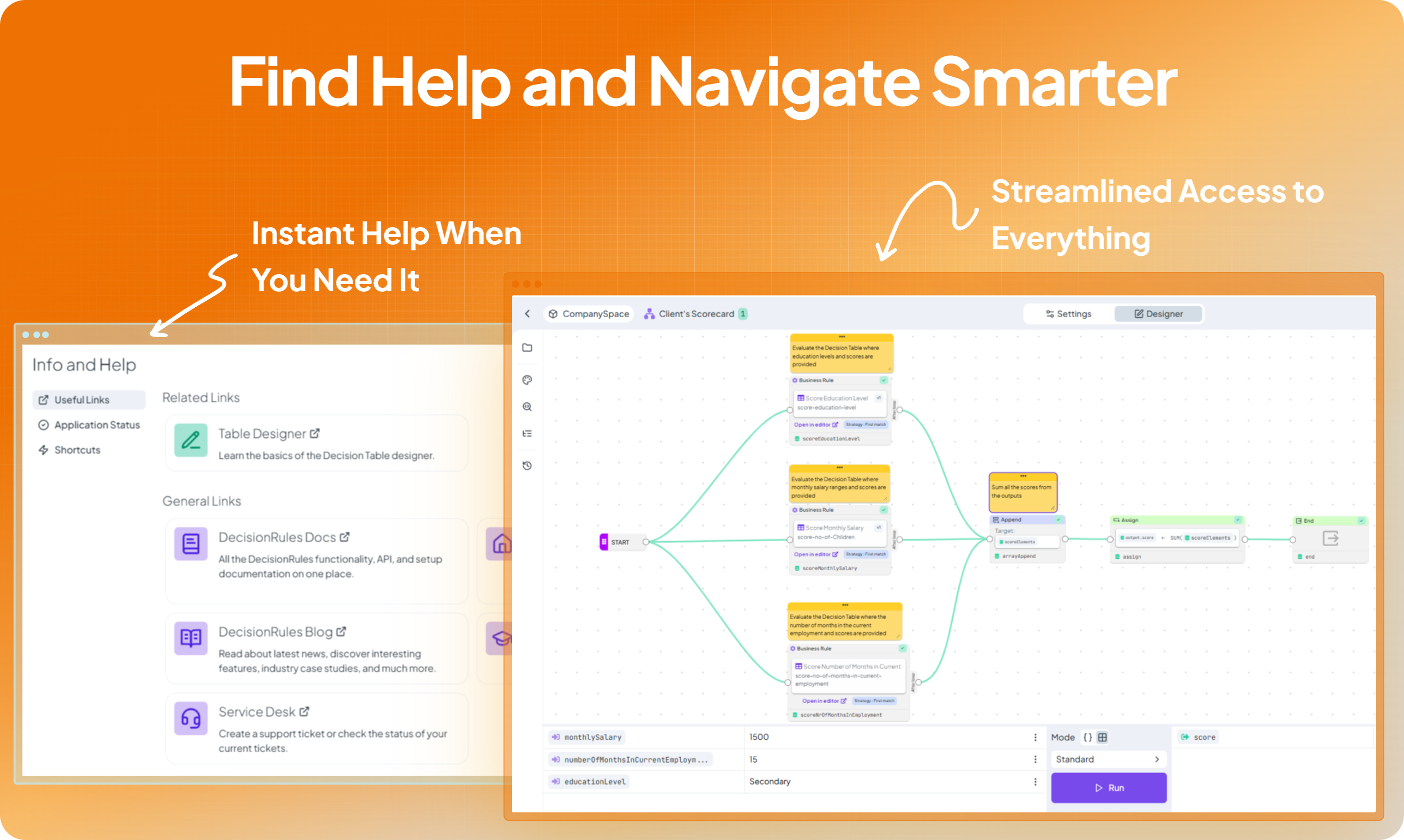 True business user empowerment. Create and modify business rules using visual decision tables, decision trees, and scripting rules—with instant testing, version control, and full audit trails. No coding required for business analysts; full REST API access for developers.