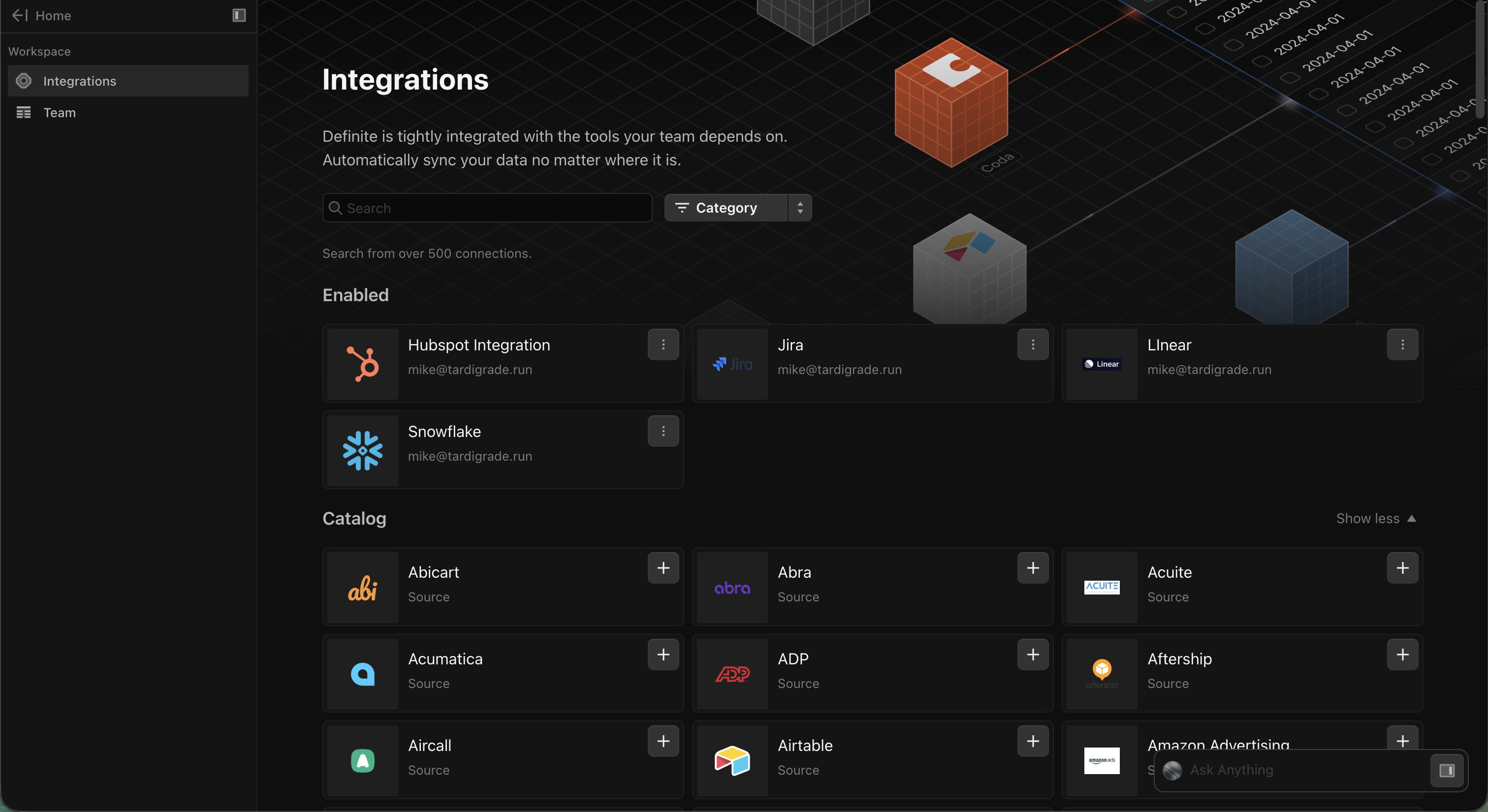 Definite was remarkably easy to set up and once it was setup the data pipelines were very reliable. I setup CRM, database, and marketing automation platform integrations, and web analytics on the first day and they were solid after that. The best feature was the AI analyst. I use it every time I have a question that would otherwise require interrogating schemas and iterating on a SQL query just to get the answer. Review collected by and hosted on G2.com.