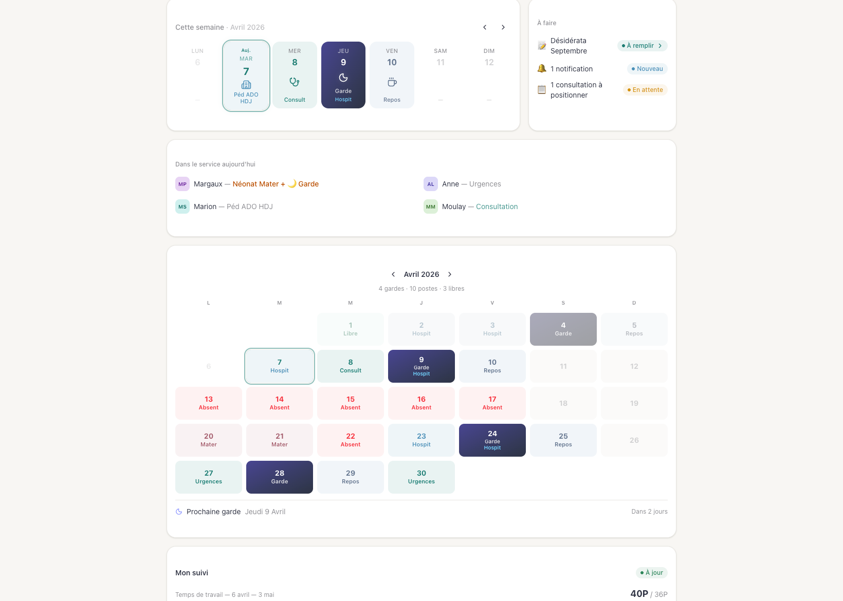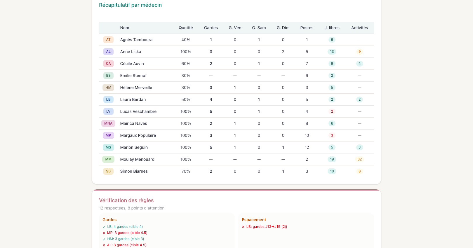 DeGarde is a medical staff scheduling application designed for hospital departments — from 5 to 100+ physicians. It automates the creation of on-call schedules (garde), daily post assignments, and rest day management using mathematical optimization.