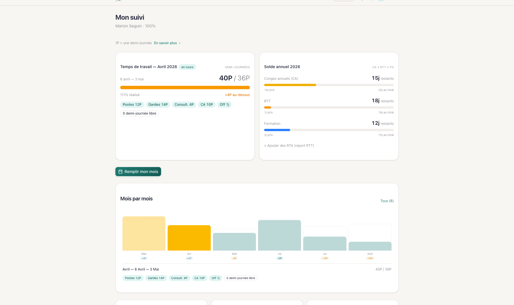 - Half-day tracking (P-system): budget vs actual per month, quarter, and year — aligned with the French legal framework of 207 days / 414 half-days per year for full-time practitioners