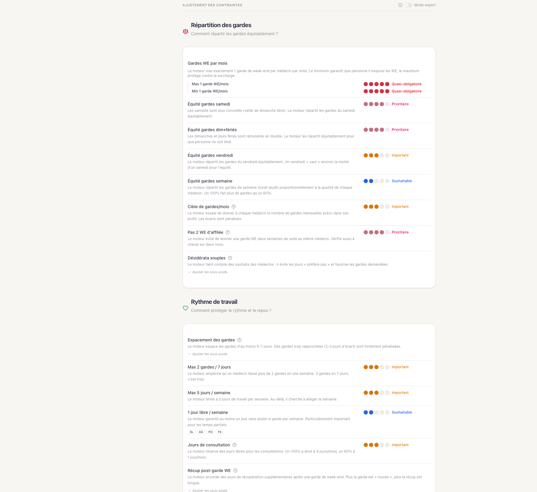 The software uses Google's OR-Tools library with the CP-SAT constraint programming solver to generate complete monthly schedules in seconds. It handles two types of rules: hard constraints (mandatory rest after a 24-hour shift, authorized working days per physician, post restrictions) and soft constraints with adjustable weights (weekend equity across Saturday/Sunday/holidays, shift spacing, post continuity, physician preferences).