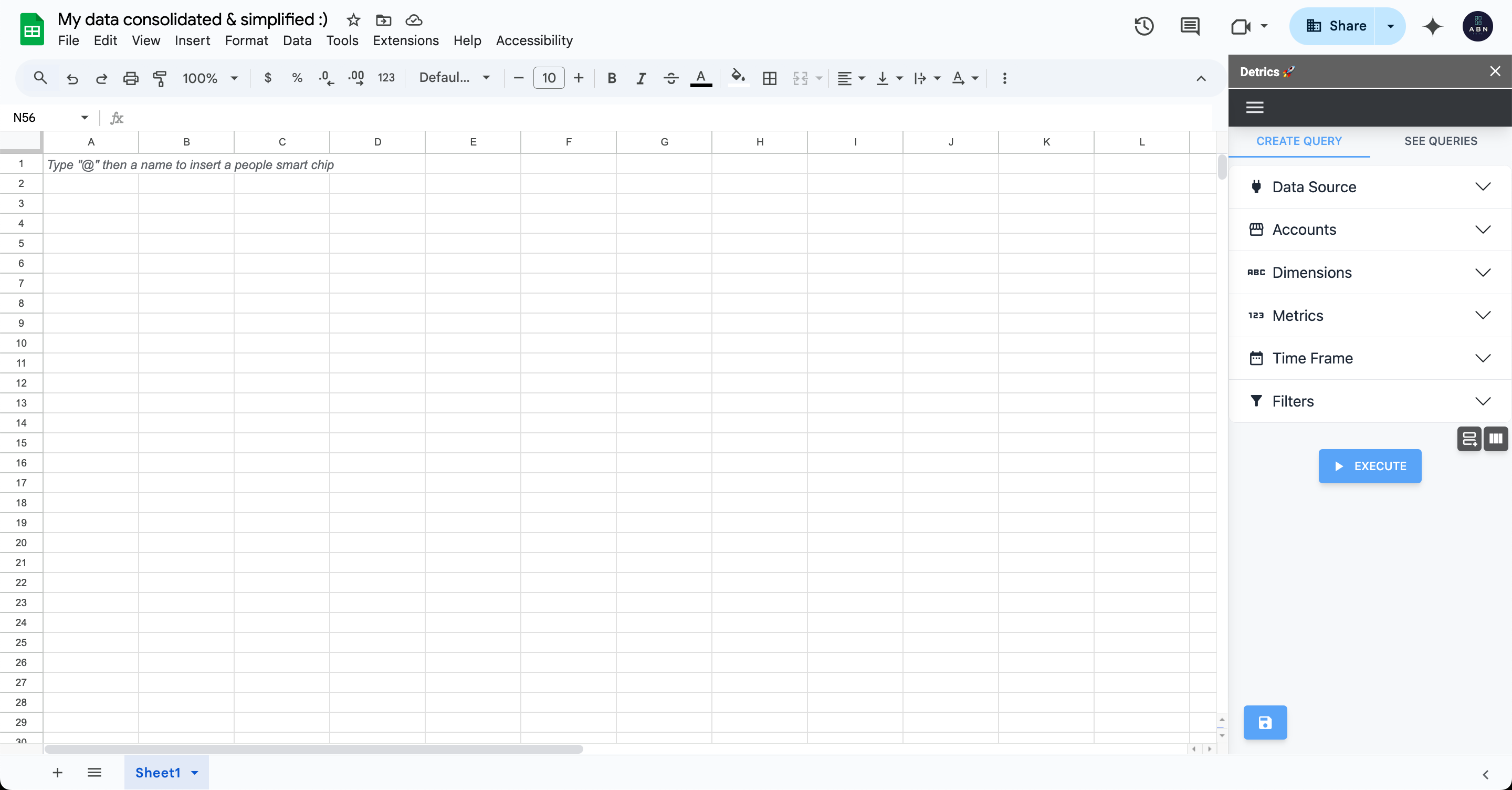 Detrics is a productivity tool for marketers. We connect all your marketing data sources to Google Sheets™ in just a few clicks, eliminating the need for manual exports or CSV file combinations. Our platform simplifies data consolidation, analysis, and visualization in real-time, allowing you to make more informed and efficient decisions.