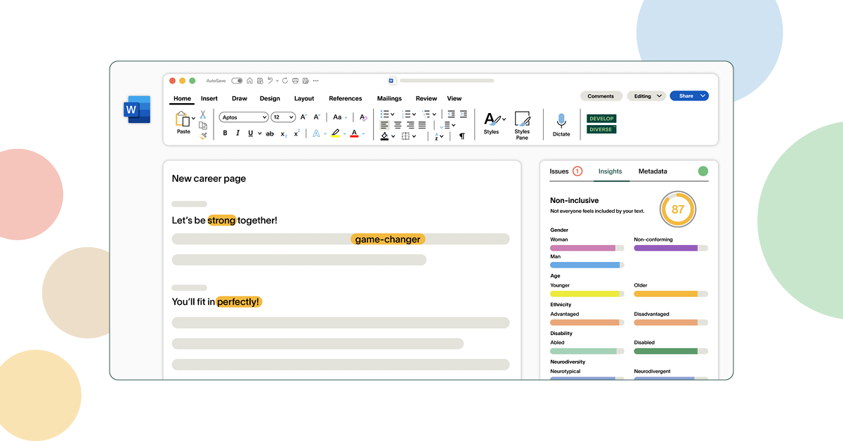 Develop Diverse has really helped us shift how we think and write - not just in terms of gendered language (which we expected), but in being more inclusive across age, neurodiversity, ability, and more. It’s been a surprisingly effective way to bring the broader DEI conversation into something tangible and actionable.