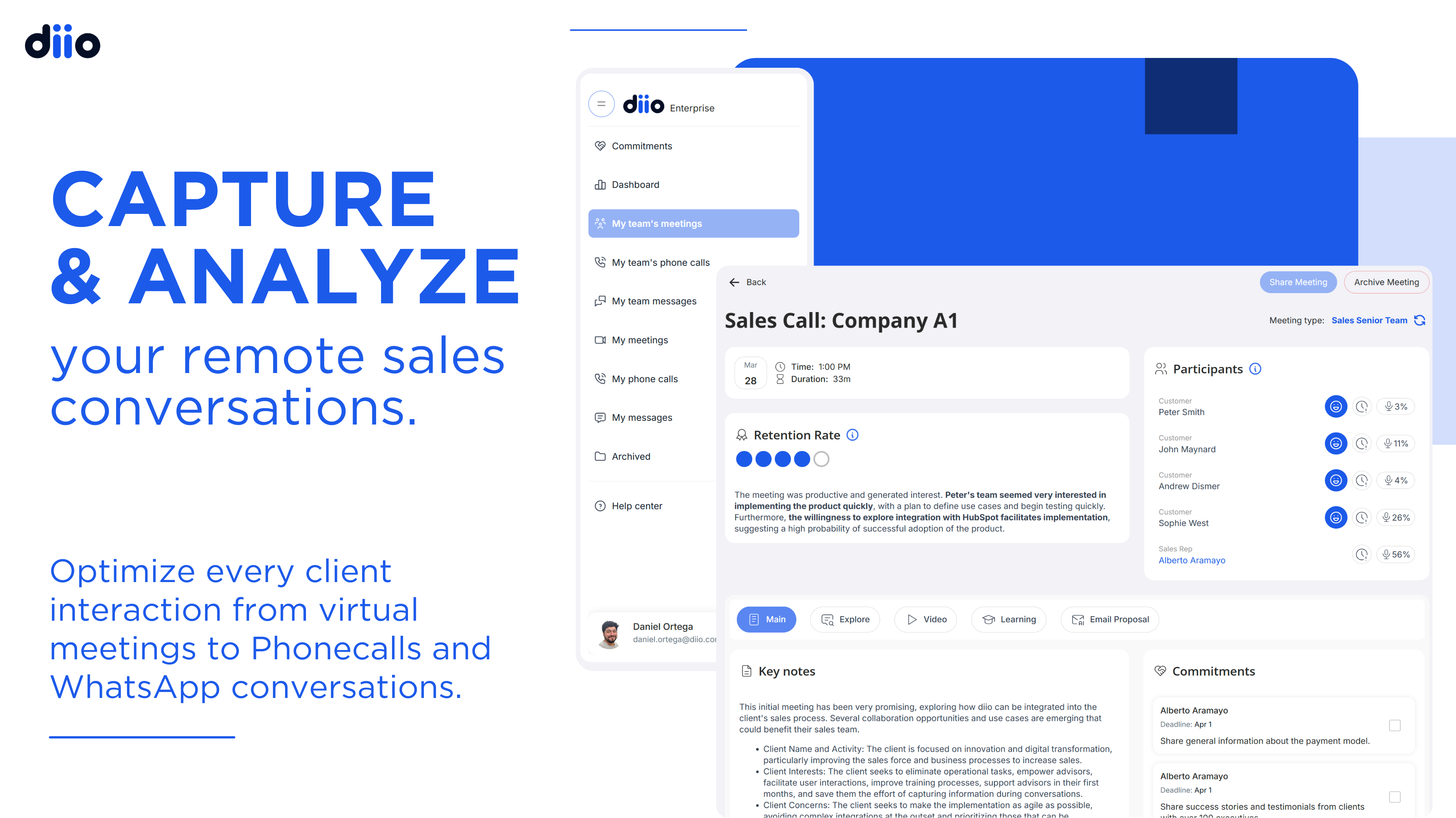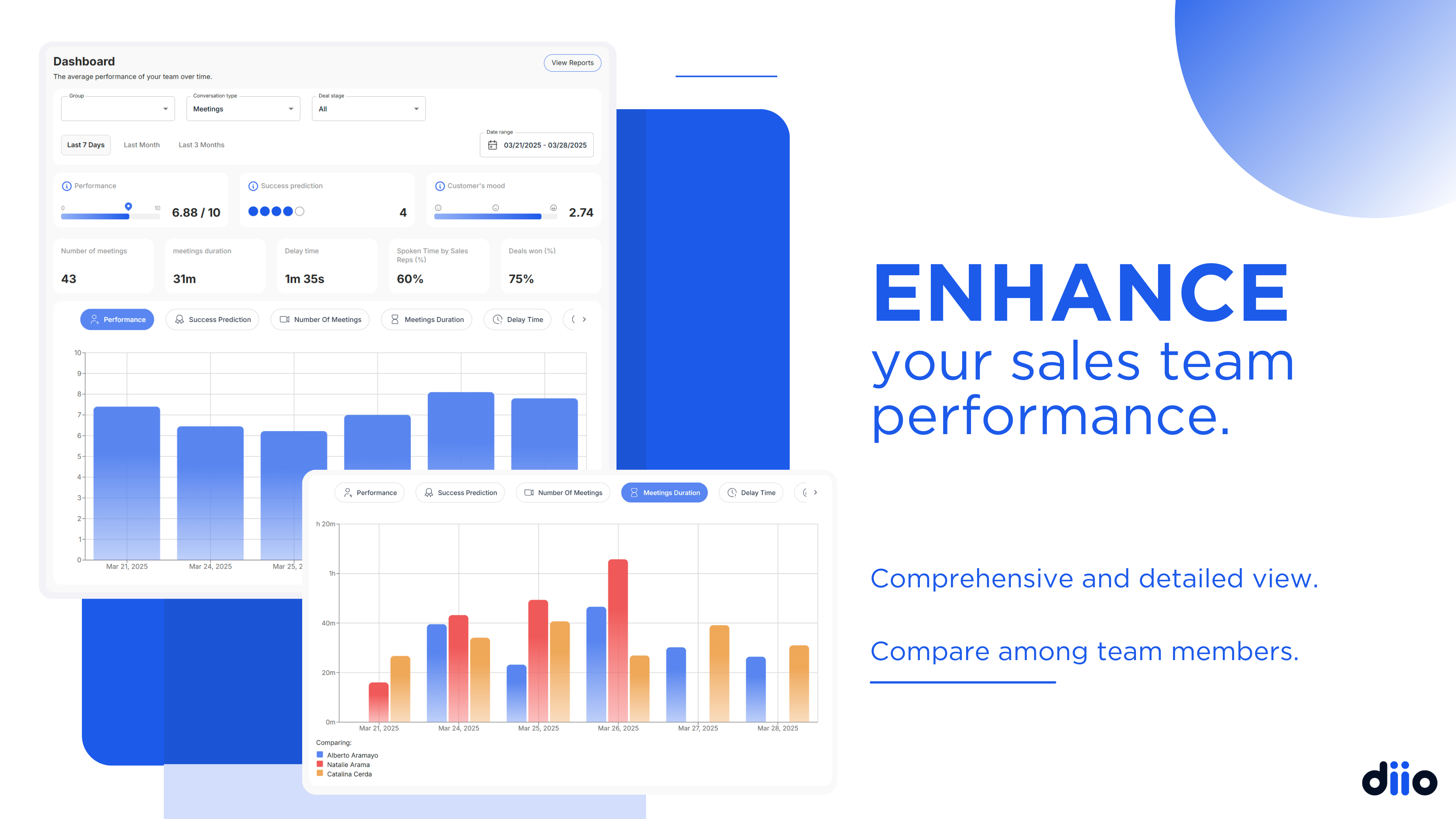 Then there's the whole sales training and performance feedback aspect. diio's insights and tips aren't just generic advice; they're tailored to my conversations and situations. It's like having a sales coach who's always on, giving me real-time pointers on how to up my game. This has made me more aware of my sales approach and helped me refine my tactics based on solid data.
