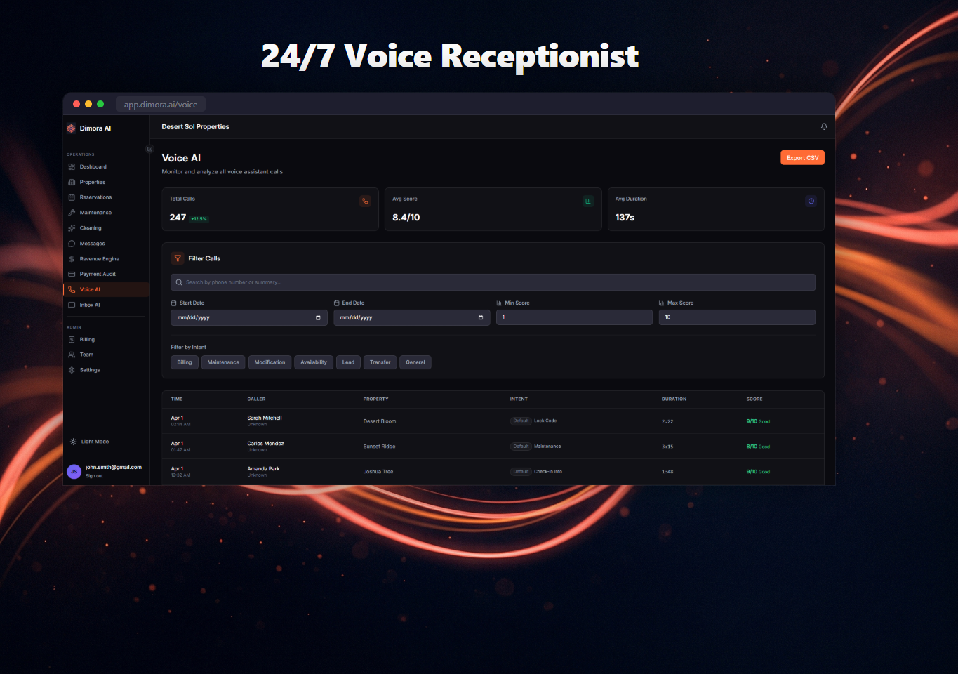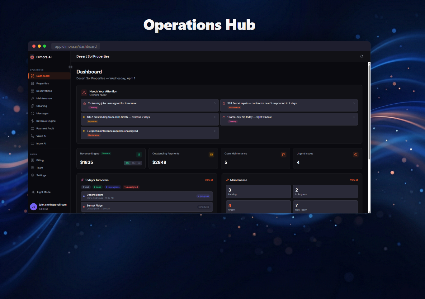Dimora AI is an AI operations platform for vacation rental managers. One PMS integration connects a multilingual voice receptionist, automated inbox, cleaning and maintenance coordination, revenue upsells, and payment auditing. It handles the work that keeps you up at night so you can grow your portfolio without growing your team.