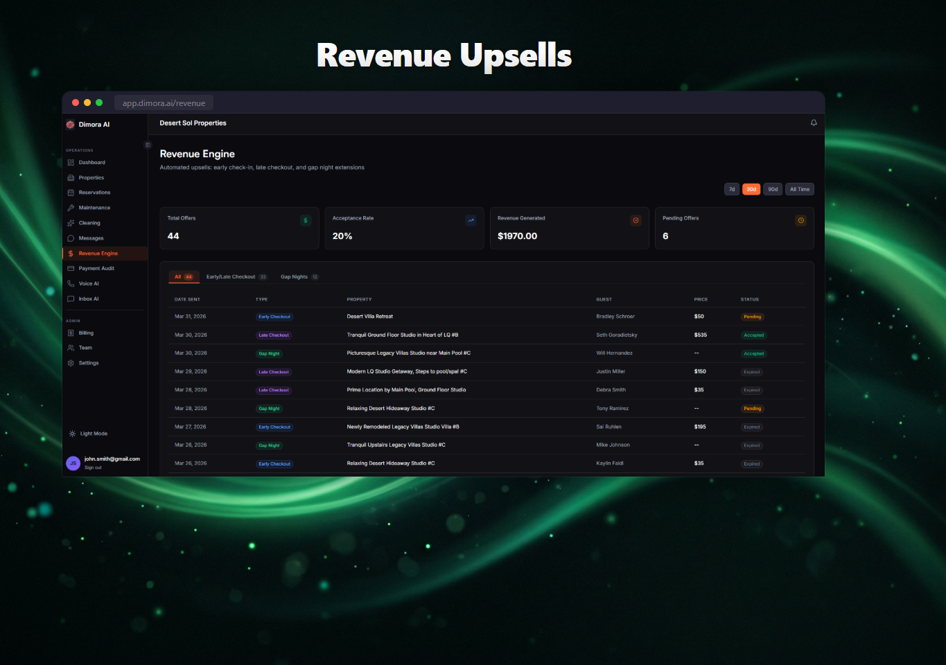 Scans your calendar for early check-in, late checkout, and gap night openings. Sends offers to guests automatically. Production data across 200+