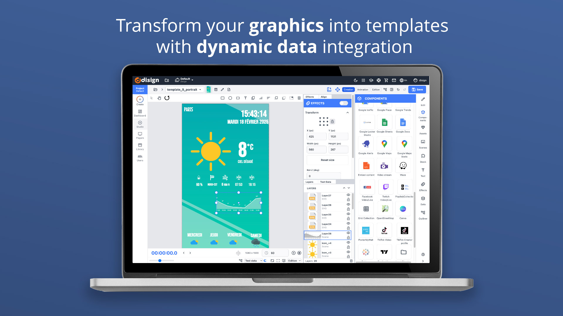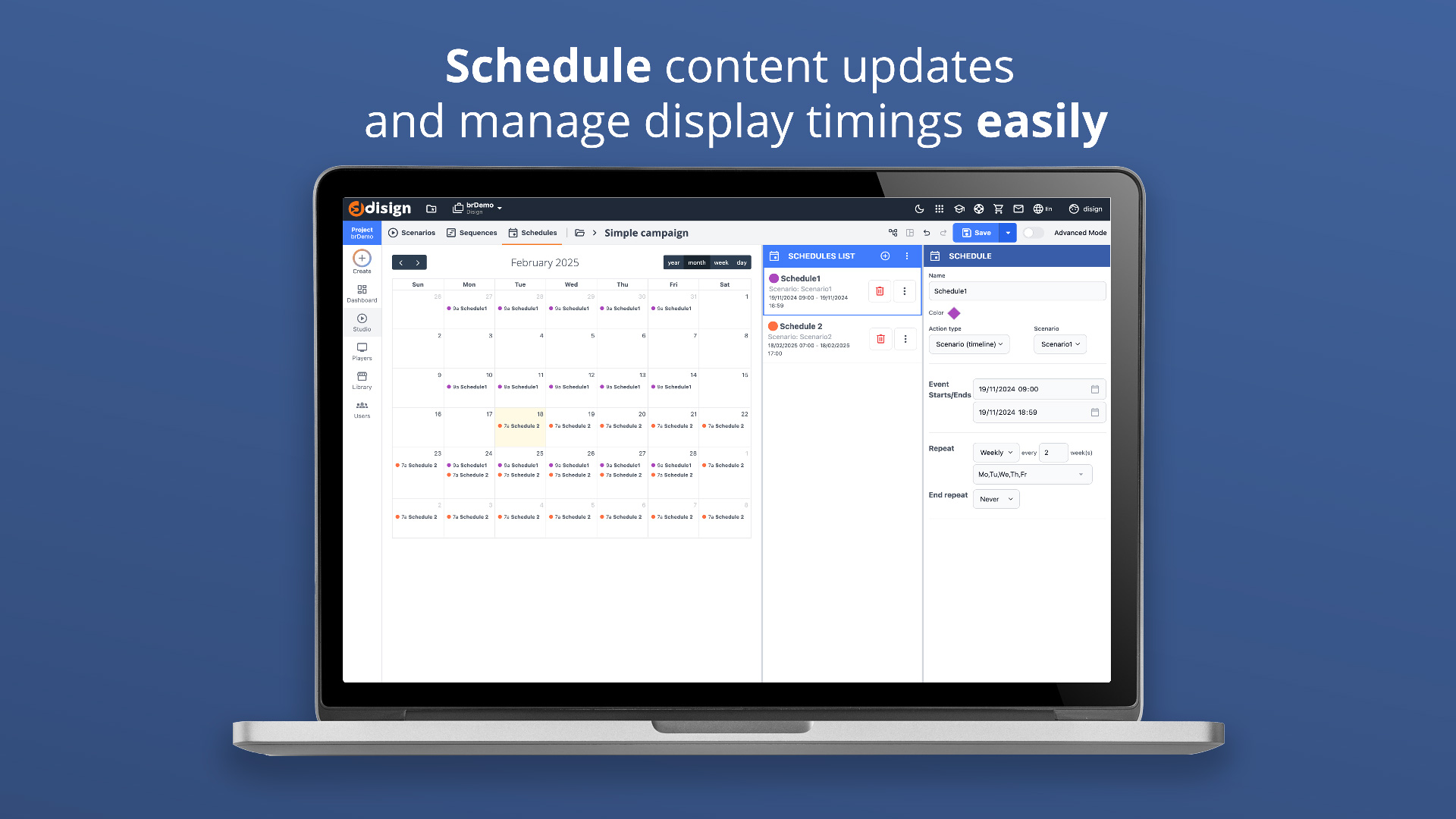 Displai makes it easy to connect and control all of your screens. Displai takes the design work out of creating professional content. It lets you create announcements, menus, calendars, & more, without moving a single pixel.