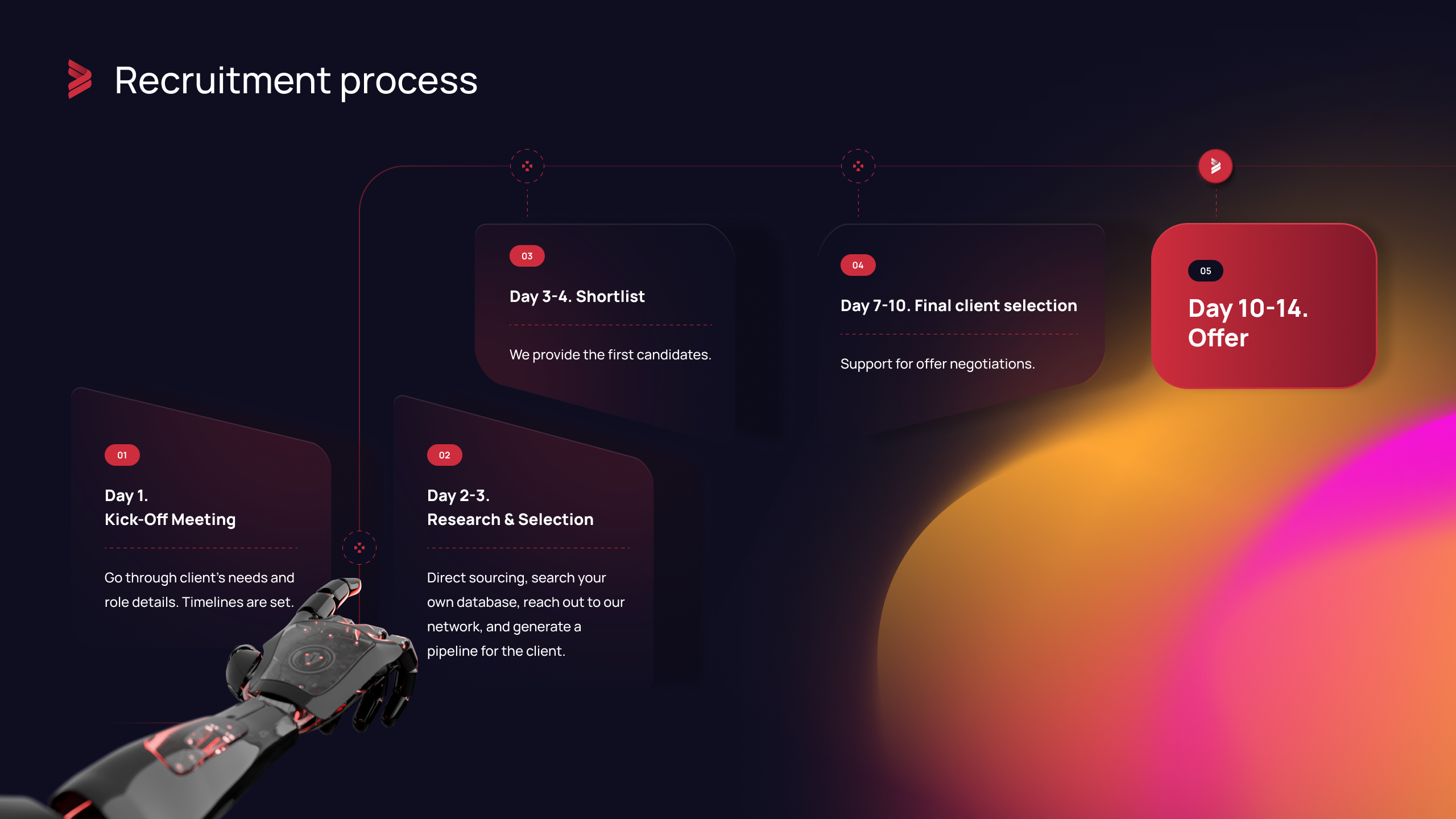 ⦿ Hand-picked candidates – Every professional is vetted through structured scorecards and role-focused interviews, ensuring accurate skill assessment and better role fit. We also use AI & automation for scheduling, note-taking, and candidate reporting to speed up the process.