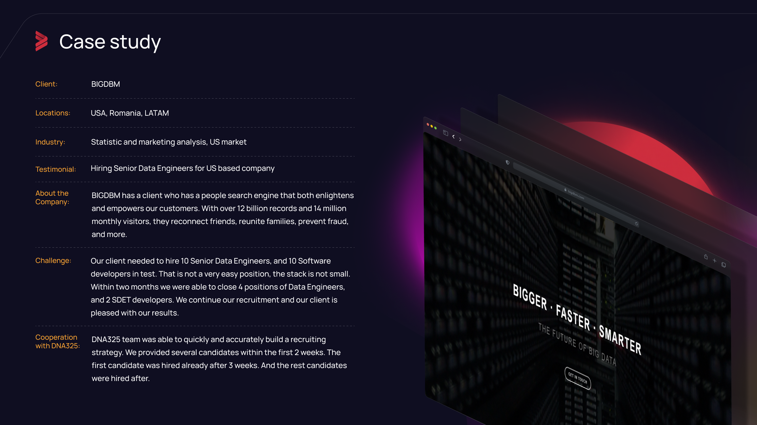 DNA325 is a 9+ year IT recruitment agency that helps US and EU companies reduce time-to-hire and access top European tech talent. We specialize in full-cycle recruitment, recruitment process outsourcing, and labor market research for mid-level+ specialists and executives.