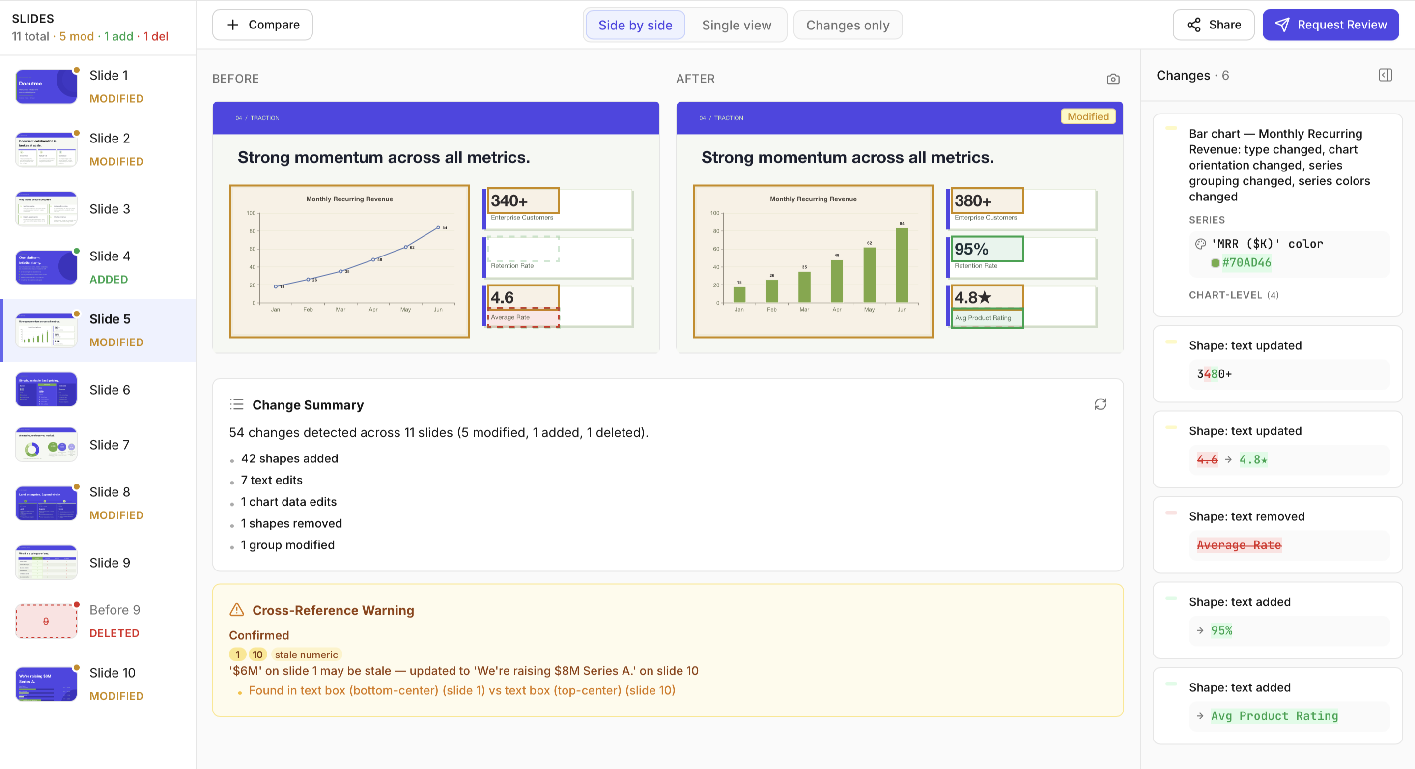 Our solution makes document creation considerably more efficient, whether building pitchbooks, due diligence reports, or other deliverables. Our features enable you to link refreshable data from Excel or Power BI to PowerPoint/Word, quickly find brand-approved content within PowerPoint, easily audit complex Excel models, and much more.