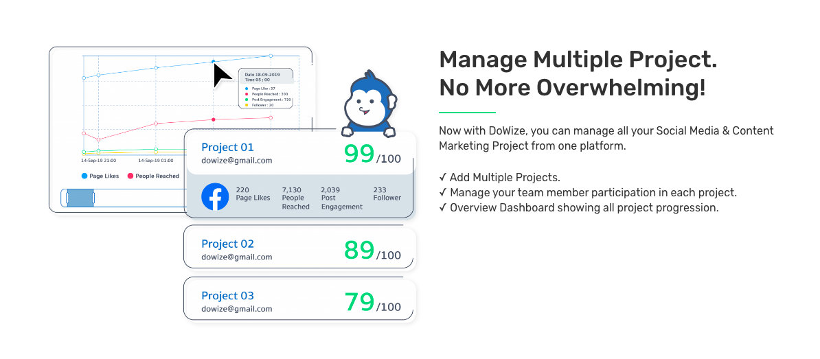✓ Add Multiple Projects. ✓ Manage your team member participation in each project. ✓ Overview Dashboard showing all project progression. Now with DoWize, you can manage all your Social Media & Content Marketing Project from one platform.
