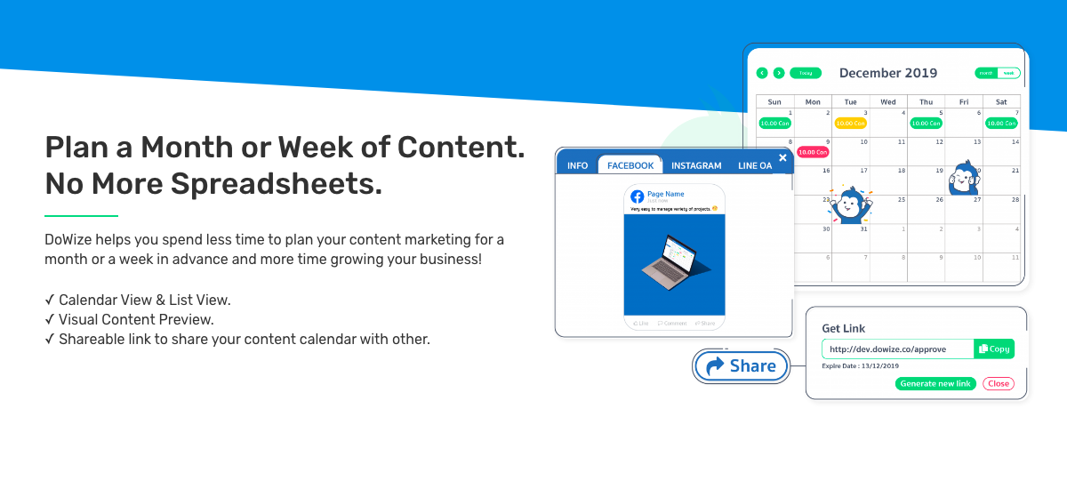 ✓ Calendar View & List View. ✓ Visual Content Preview. ✓ Shareable links to share your content calendar with others. DoWize helps you spend less time to plan your content marketing for a month or a week in advance and more time growing your business!