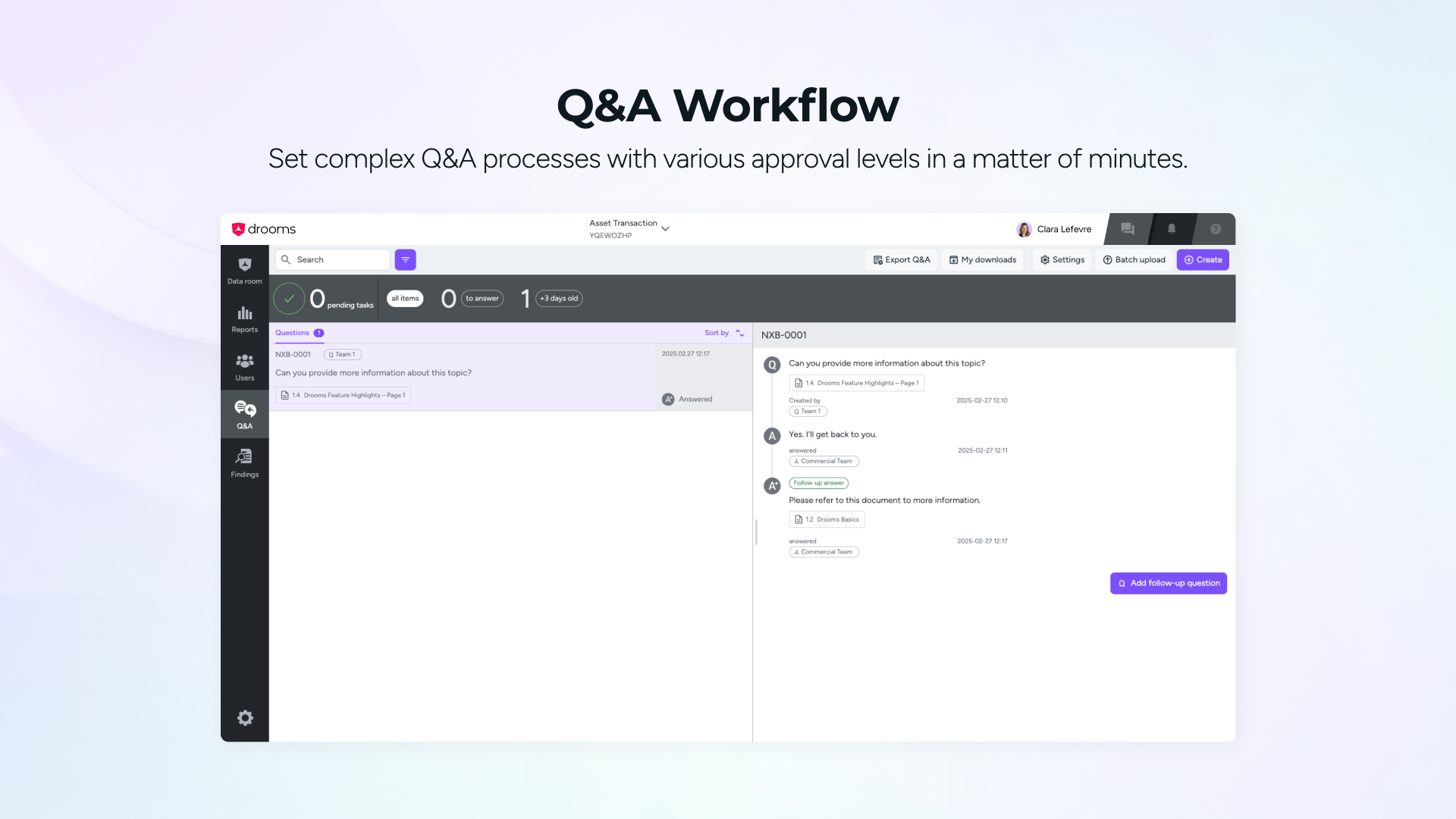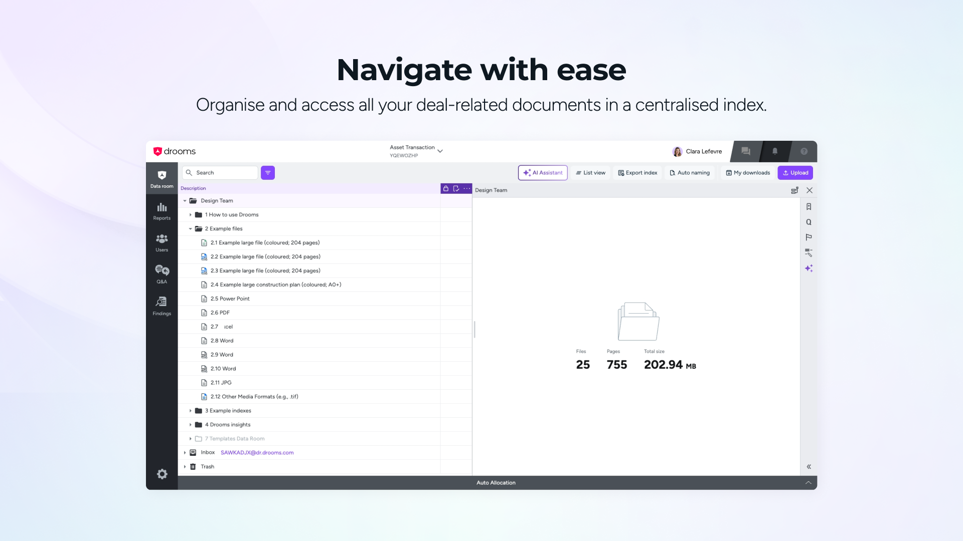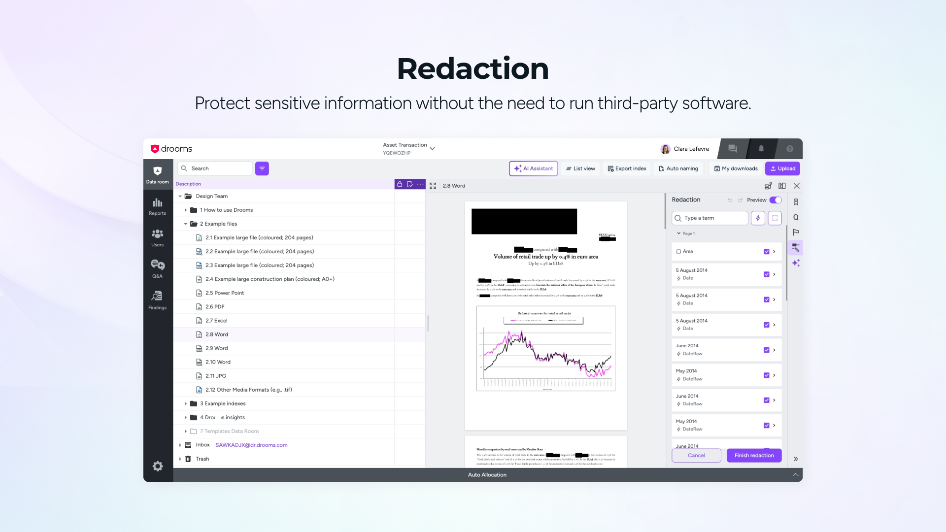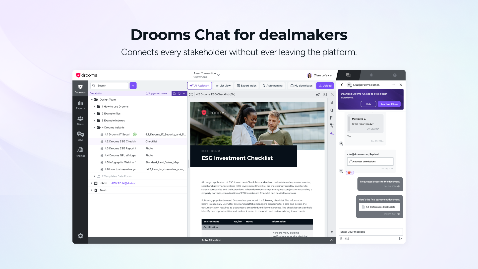 Drooms guarantees data security and GDPR compliance with its private, geo-redundant servers in Switzerland and Germany. State-of-the-art technologies and internally developed AI solutions facilitate seamless collaboration for all stakeholders by controlling the data flow in all phases of the asset lifecycle and accelerating deal processing. With the Drooms Online Archive, all transaction data is permanently digitised and immediately available for new transactions.