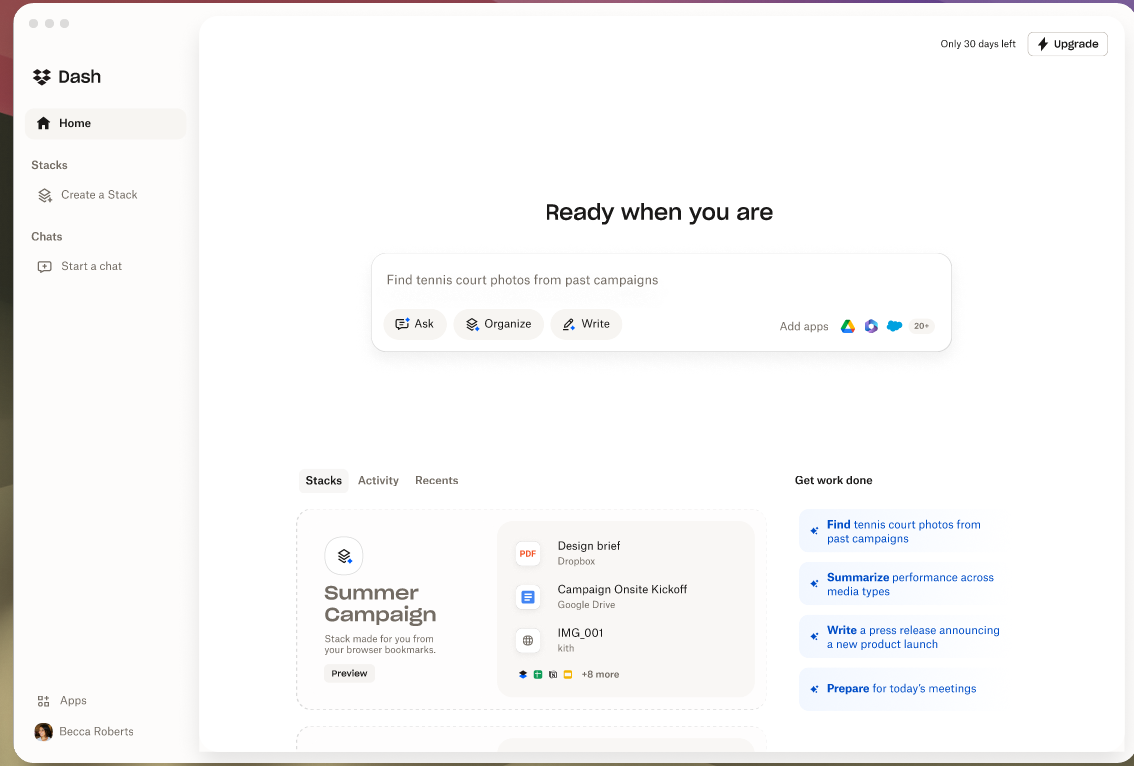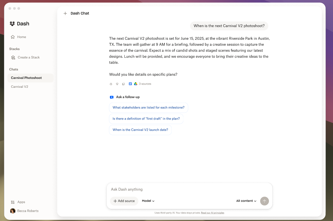 What I like best about Dropbox Dash is how it brings everything together in one place. Instead of jumping between different tools, I can use the universal search to find files, links, and documents instantly — whether they’re in Dropbox, Google Drive, Slack, or elsewhere. The AI-powered shortcuts and summaries also save a lot of time by helping me get to the right information faster and stay focused. Review collected by and hosted on G2.com.