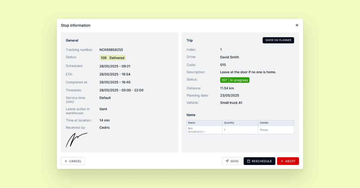 Every delivery is unique with a stop having a servicing time slot, ASAP delivery or special needs, the software caters to all of this via time windows an comments.