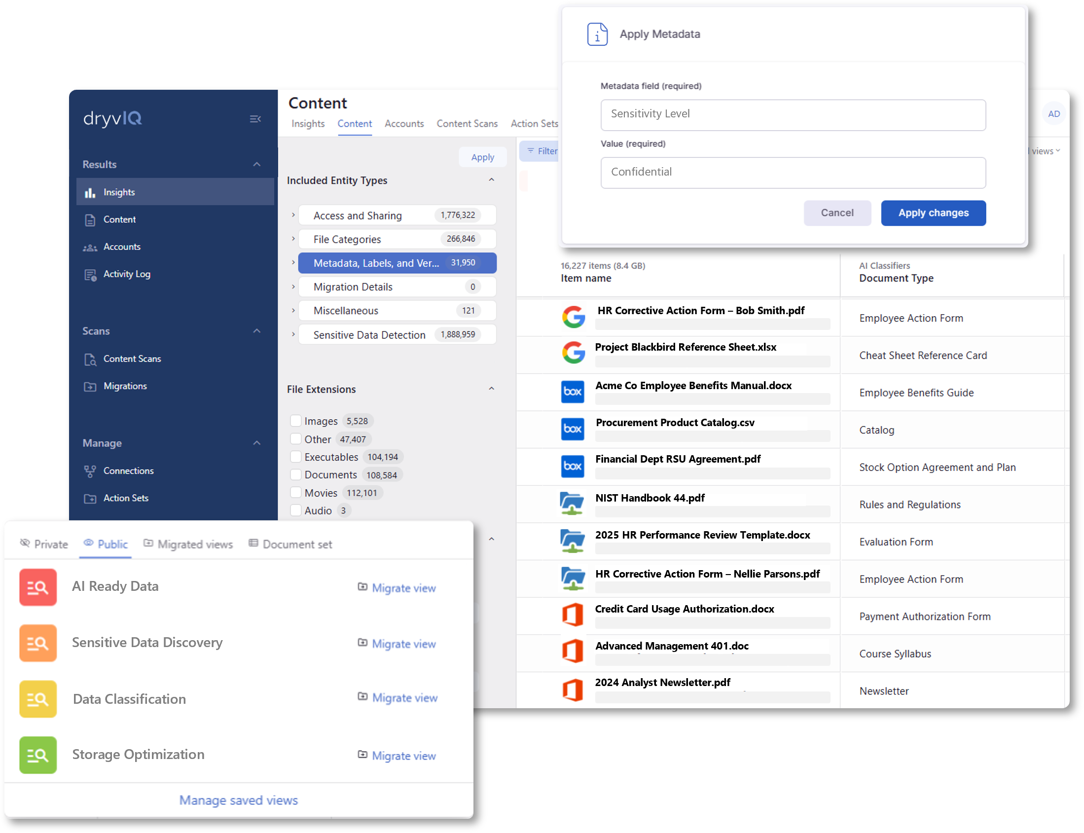 DryvIQ automates classification and applies rich metadata based on the actual substance of content—not just surface-level file properties. Files are organized into appropriate taxonomies, moved to the correct locations, and continuously enriched with business-relevant metadata. This intelligent structuring provides the clarity needed for compliance, governance, and insight generation across your entire content estate.