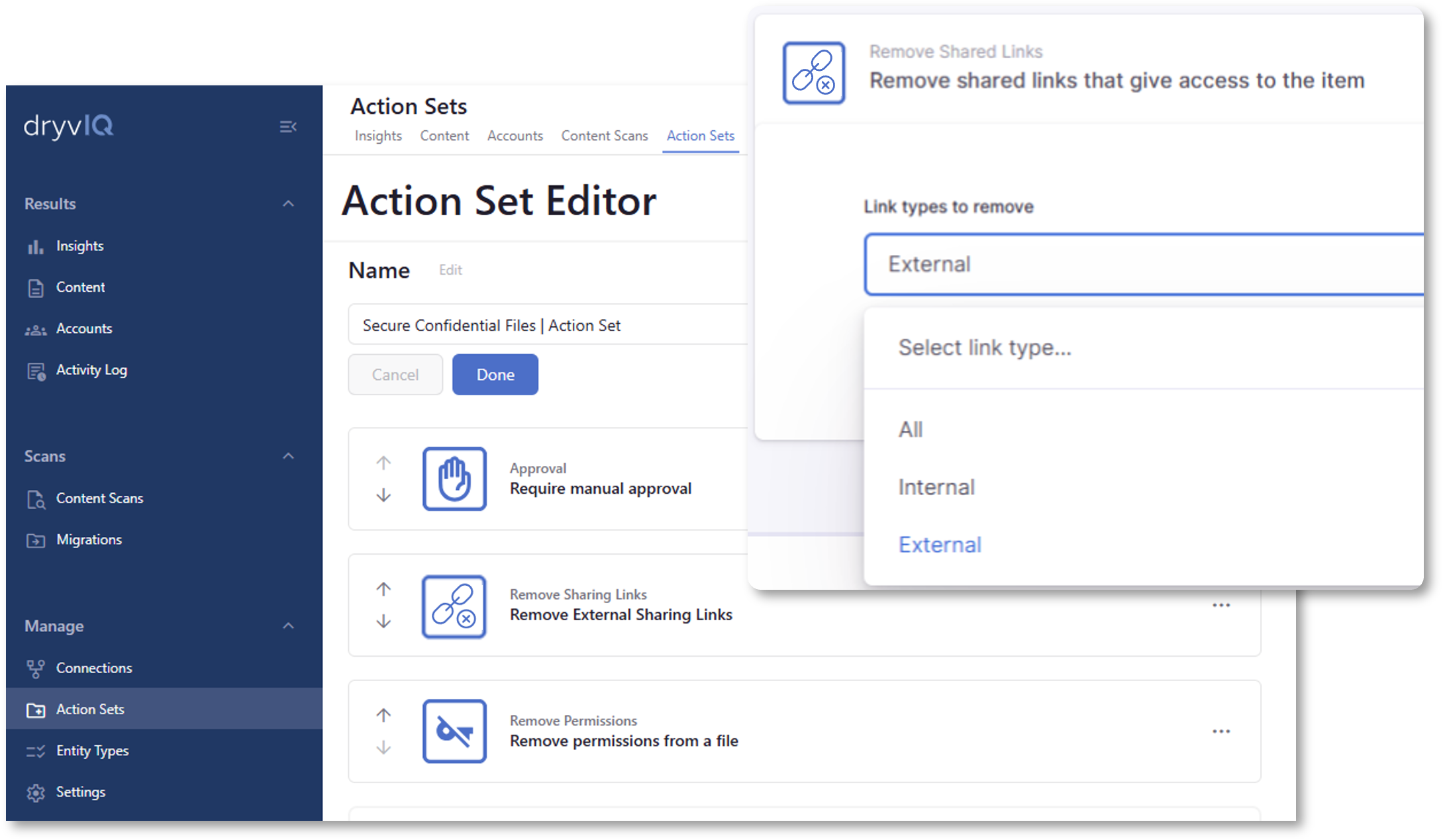DryvIQ continuously audits and updates sharing permissions and access controls to ensure only the right users have access. The platform enforces rules in real time by modifying permissions, applying Microsoft Purview Information Protection (MPIP) labels, Box Shield, or DryvIQ Persistent labels, and quarantining exposed content when needed. The result? Reduced vulnerability and increased trust in your unstructured data.