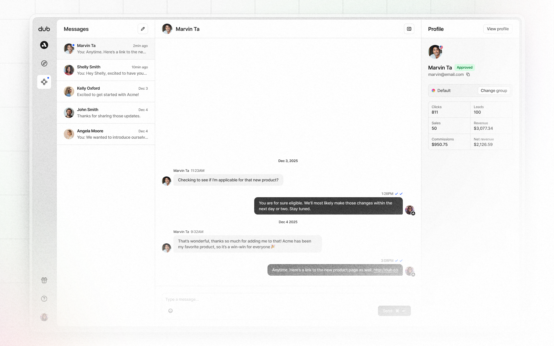 Dub is easy to navigate and quick to set up. The core features are thoughtfully designed and actually useful, not bloated. Their affiliate tools are solid and reliable, which matters when you’re running a real program at scale. On top of that, they ship updates frequently and keep improving the product instead of letting it stagnate. Review collected by and hosted on G2.com.