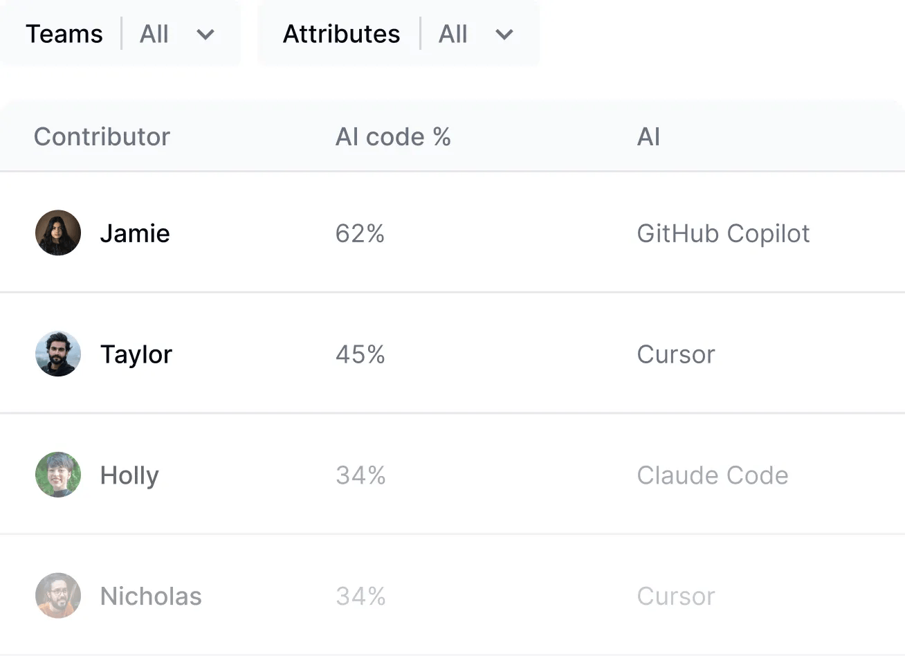 AI Usage Analytics provides a unified, granular view of tool adoption by tracking engagement across different teams, roles, and seniorities. This allows organizations to identify power users, reclaim unused licenses, and ensure AI investments are effectively integrated into the daily developer wo...