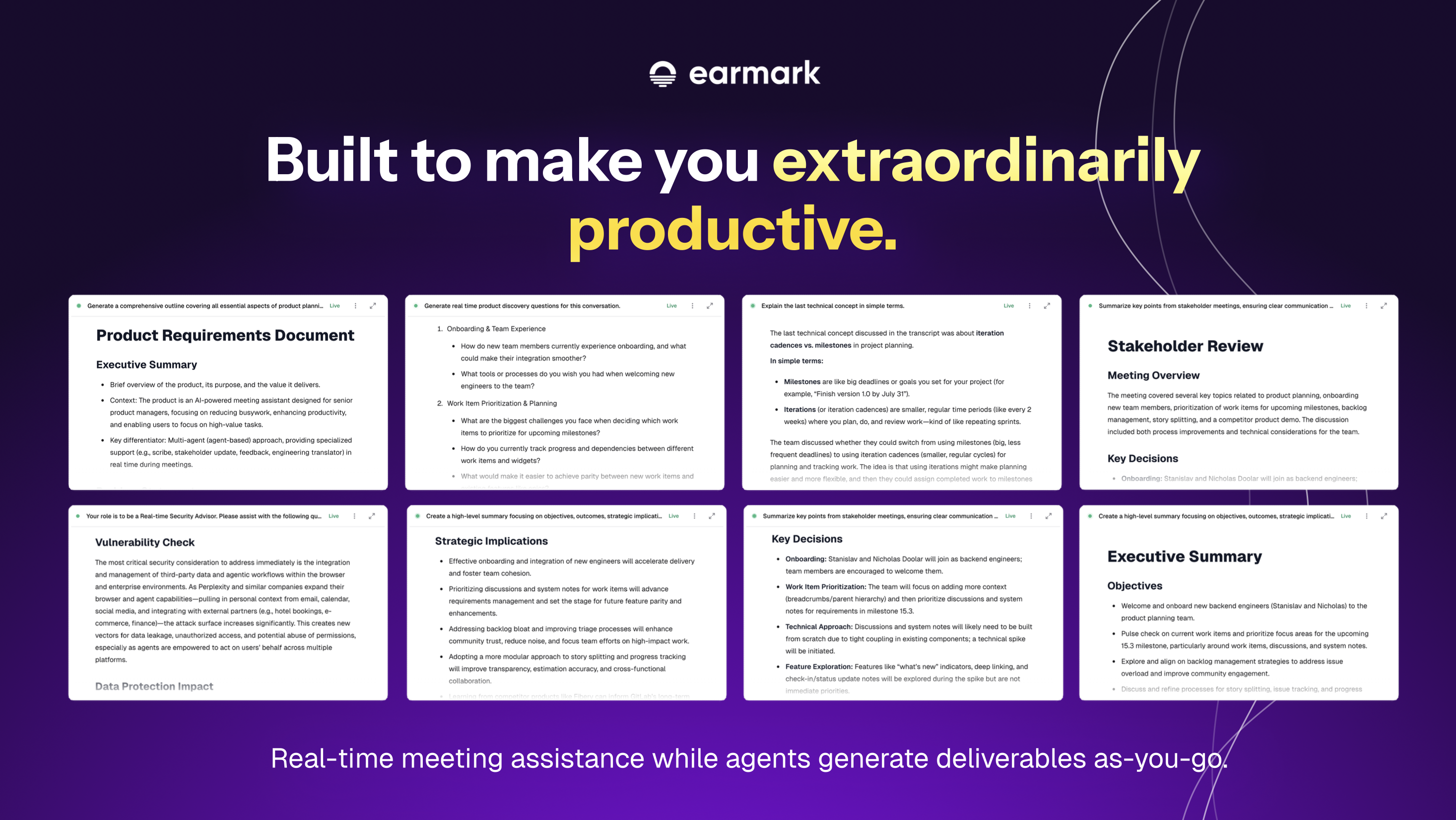 Earmark has fundamentally elevated how I operate across cross-functional teams by enabling seamless, real-time synthesis of conversations without disrupting the flow of work. In fast-paced discussions, I no longer need to toggle between active participation and manual note-taking—Earmark captures key points, risks, next steps, and strategic opportunities automatically. Its ability to search conversations on demand and surface contextually relevant insights or even craft timely, open-ended questions makes it feel less like a tool and more like a thinking partner. It’s dramatically increased my efficiency and presence across meetings, turning complex multitasking into a streamlined, high-leverage workflow. Review collected by and hosted on G2.com.