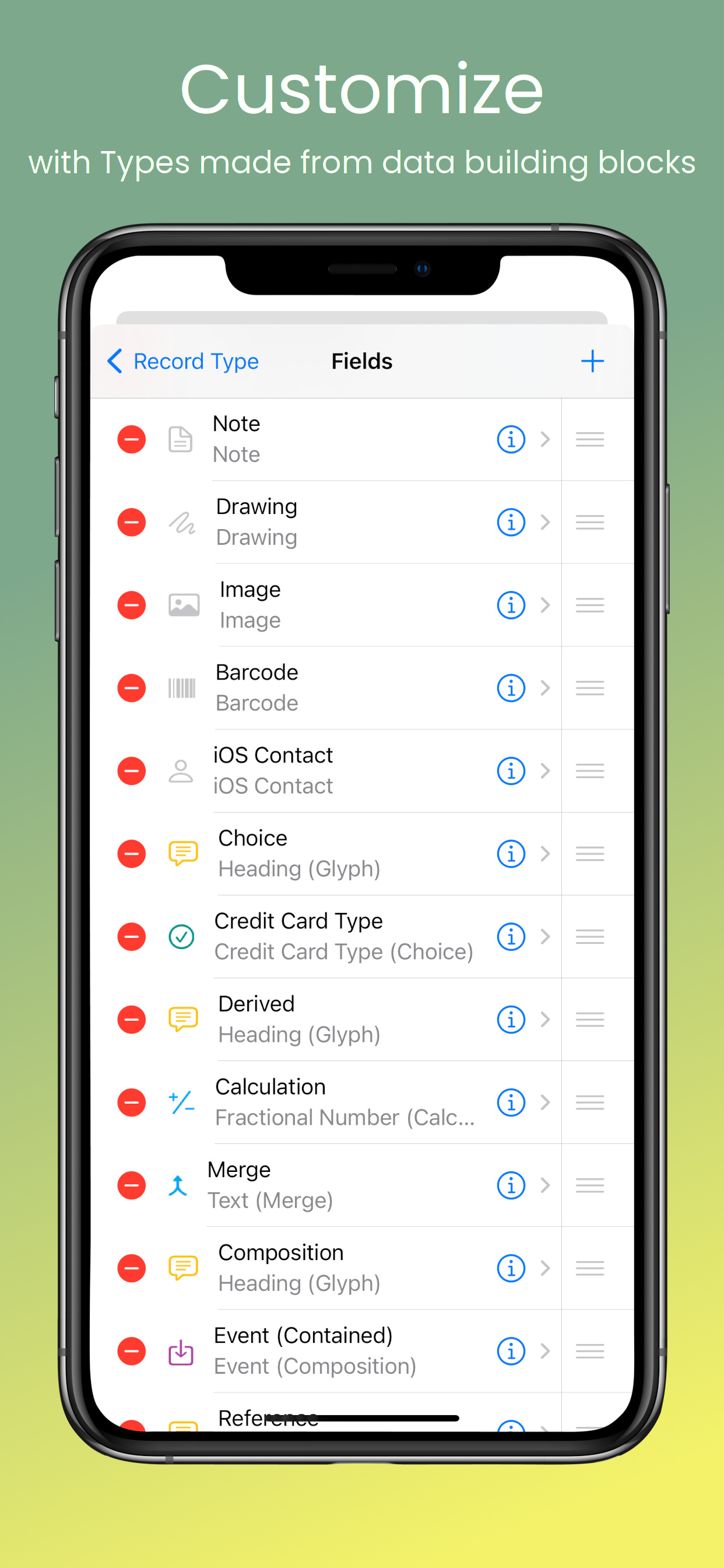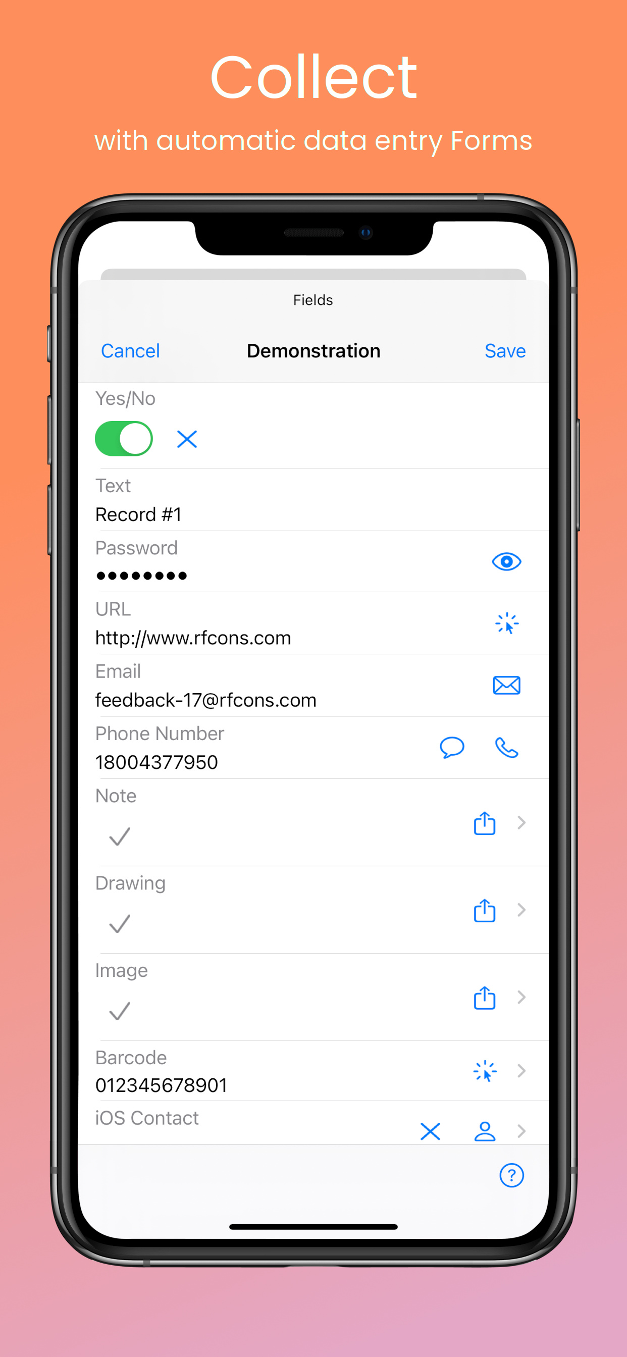 Diverse building blocks to assemble complex data: Barcode (scan) • Number • Currency • Date • Distance (mileage) • Drawing (signature capture, signature cards, ...) • Duration • Email • Image • iOS Contact (association) • Note (multi-line) • Password (hidden text) • Phone Number • Time • Text • URL (hyperlink) • Yes/No.