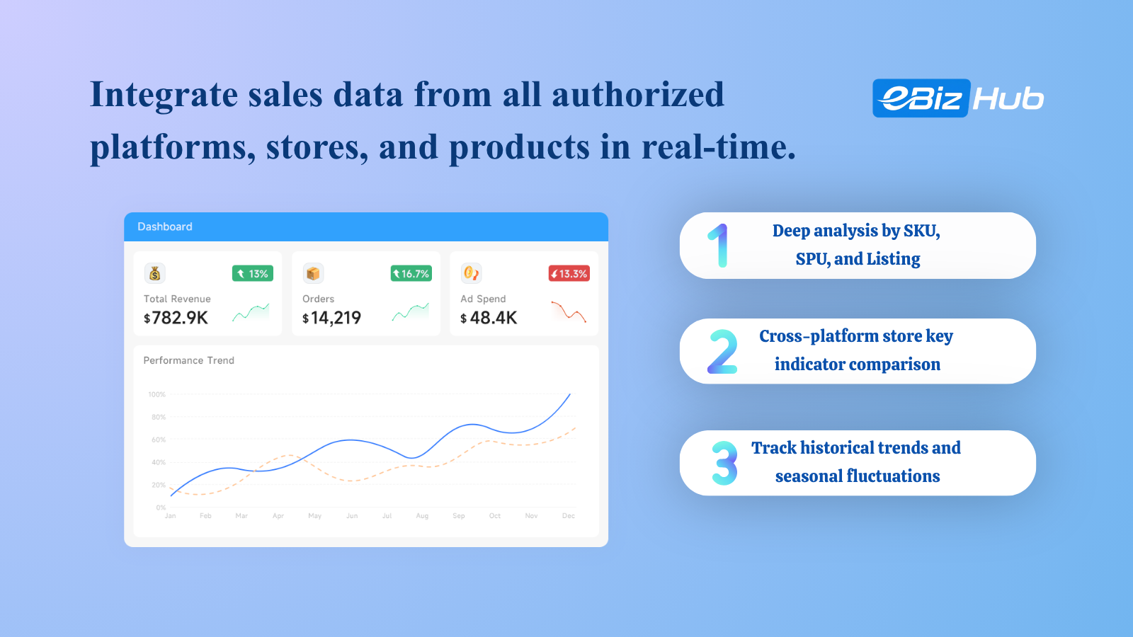 Integrate sales data from all authorized platforms, stores, and products in real-time.