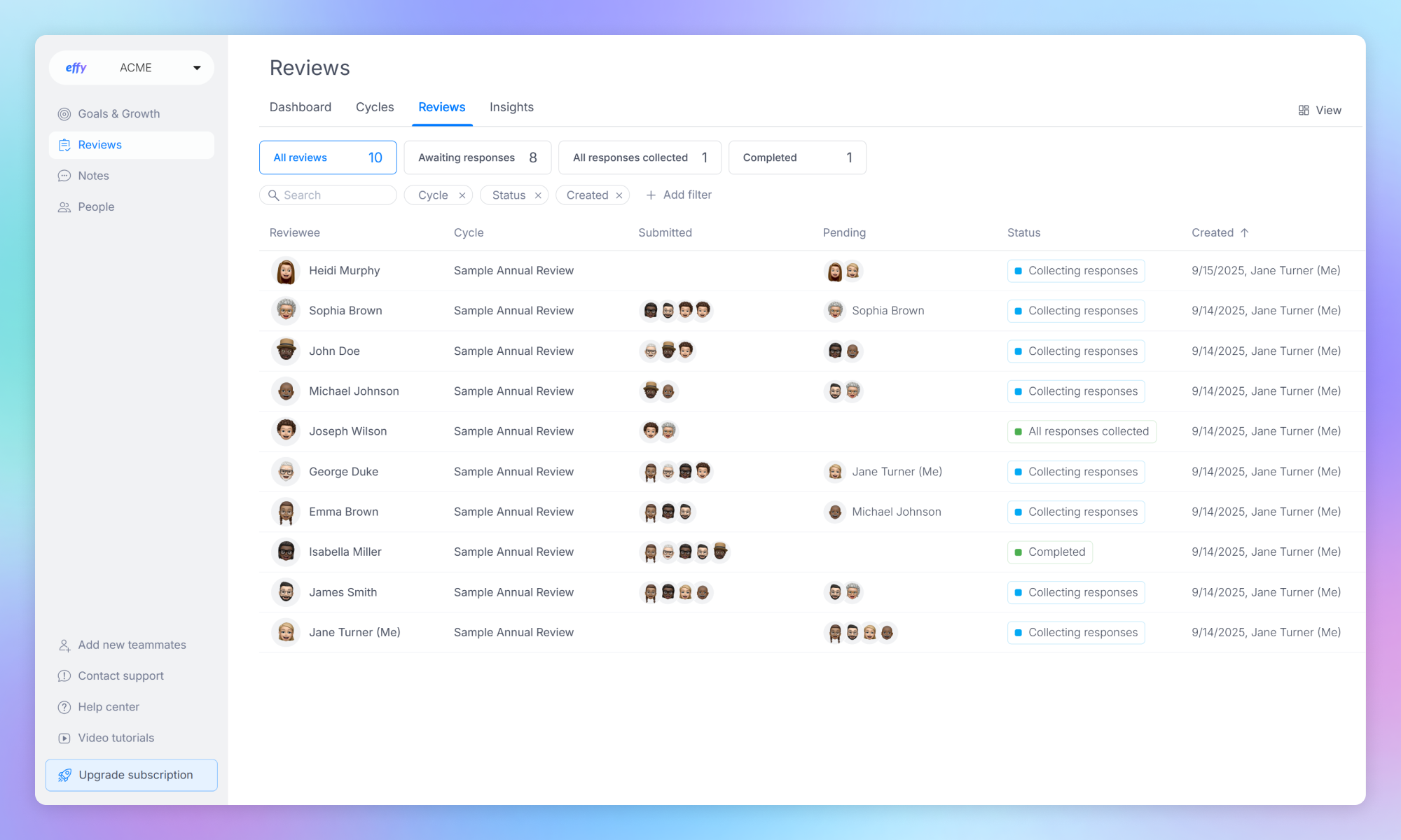 Effy AI replaced our scattered system of Excel sheets and Microsoft Forms with one centralized, easy-to-use platform. The automated reporting and insights are a game-changer. What used to take us days now takes minutes. Features like the spider chart and the company-wide heatmap allow us to see feedback from all angles. Our managers save hours on manual comparison with clear, structured summaries. Review collected by and hosted on G2.com.