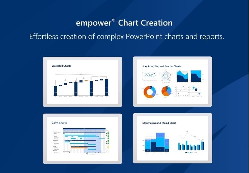 empower® Chart Creation is designed specifically for building complex business charts in PowerPoint and is ideal for data-driven, professional presentations. With more than 40 chart types, including waterfall, Mekko, and Gantt charts, as well as Excel linking, intelligent add-on elements, and automatic layout adjustments, users can create and edit charts approximately 50 percent faster than with standard PowerPoint features.