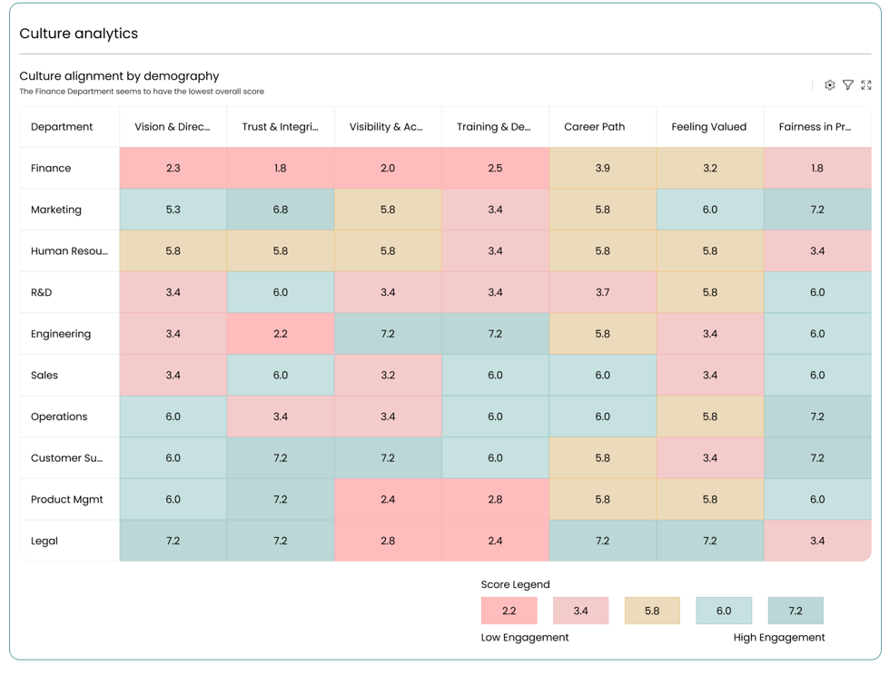 Not all teams experience culture the same way. Our heatmap view breaks down alignment themes across departments from Finance to R&D, revealing hidden disengagement and priority areas like fairness, visibility, and belonging.