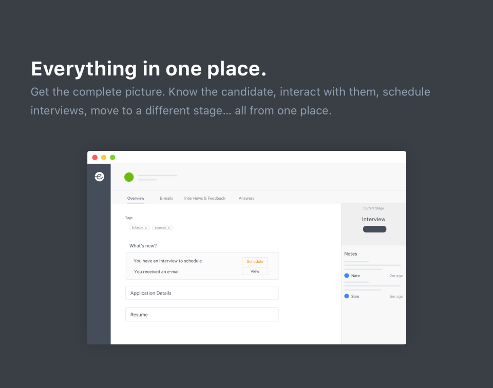 The platform was built to help you get better at recruiting. Find better talent, conduct more meaningful interviews and get the data you need to improve your process and make the right decisions, faster.