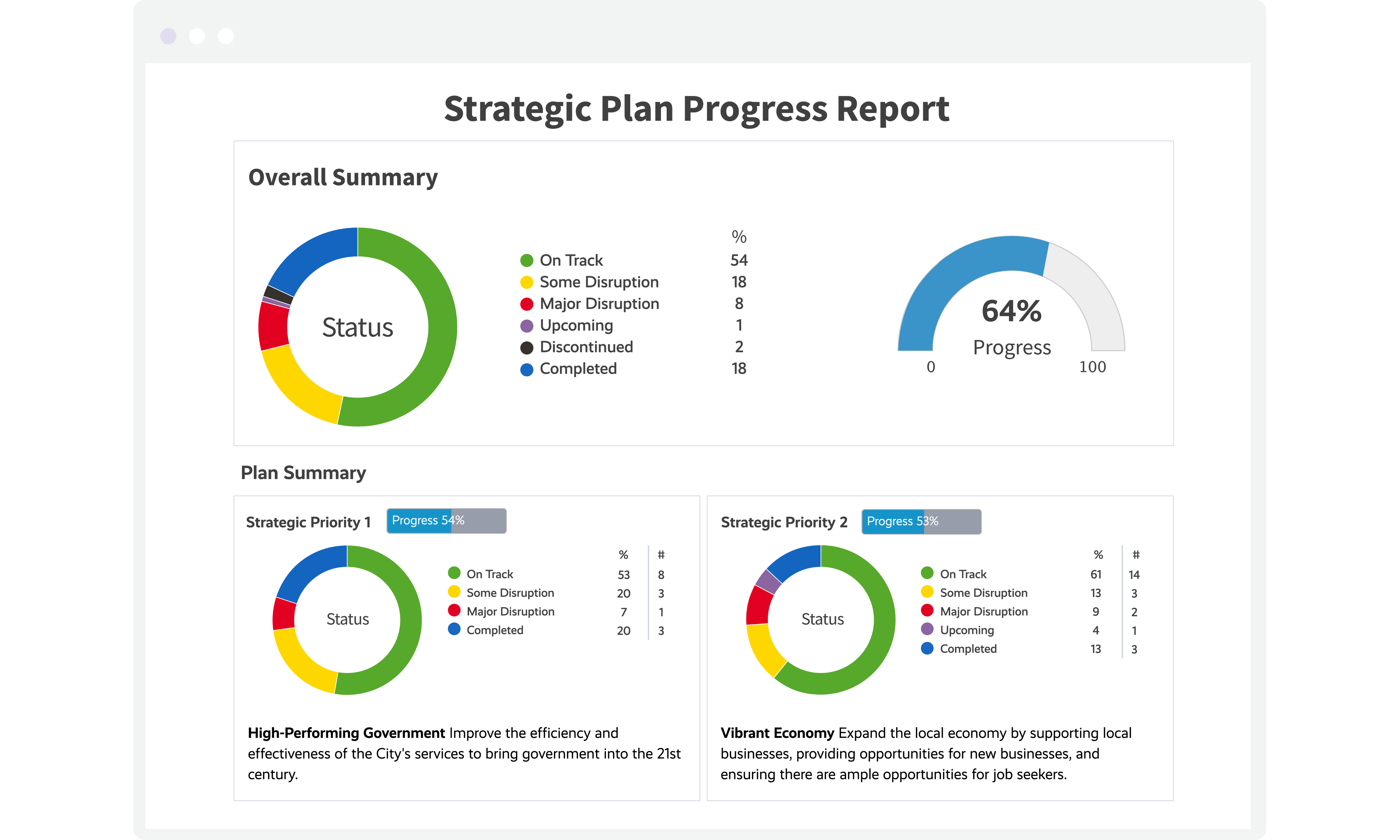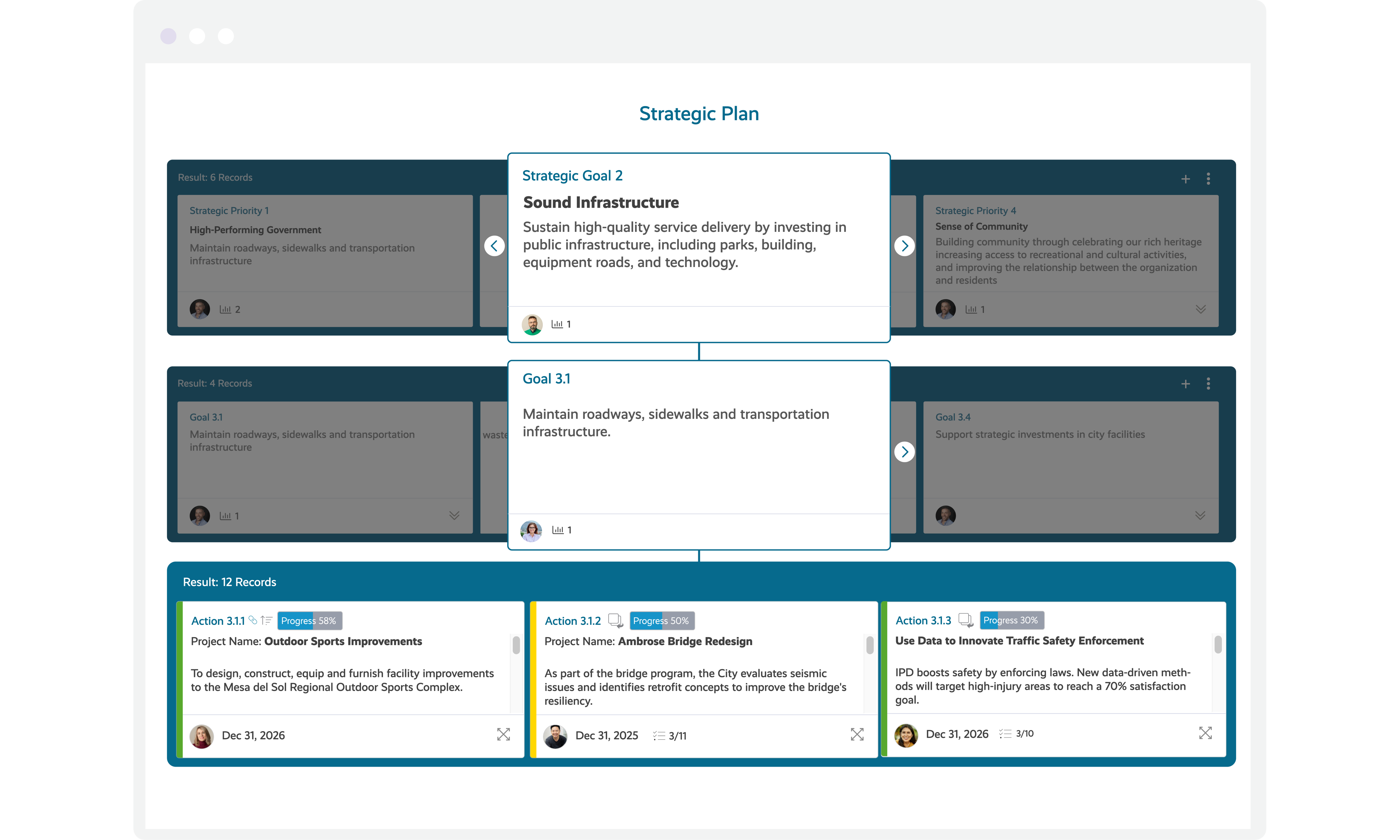 Bring your strategic plan to life. Define strategic priorities, actions, projects, and outcomes and track progress over time. Envisio supports long-range plans, multi-year strategies, and planning frameworks commonly used in the public sector.