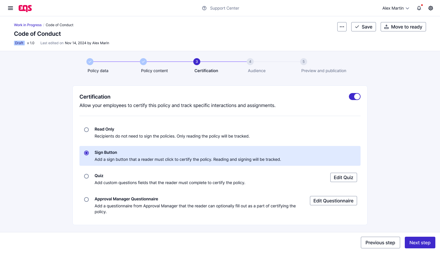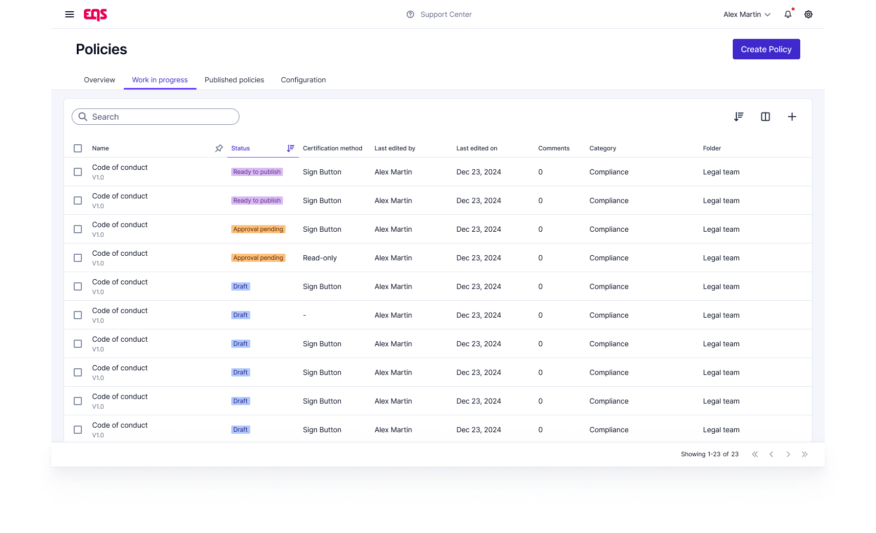 EQS Policies sometimes come across as somewhat rigid, offering limited options for customization at the branch level. I would also appreciate quicker support and more user-friendly training resources to help teams adapt more efficiently. Review collected by and hosted on G2.com.