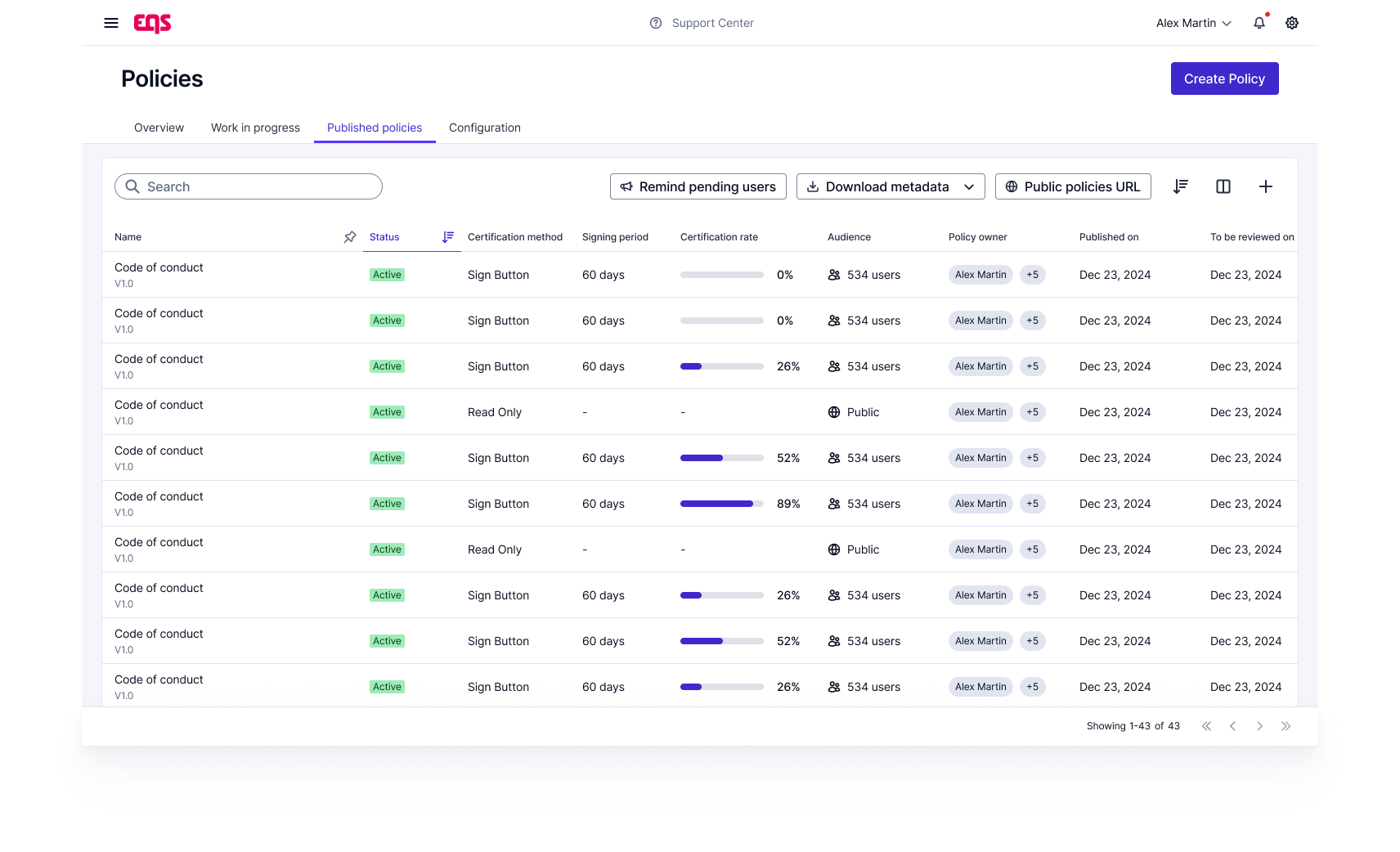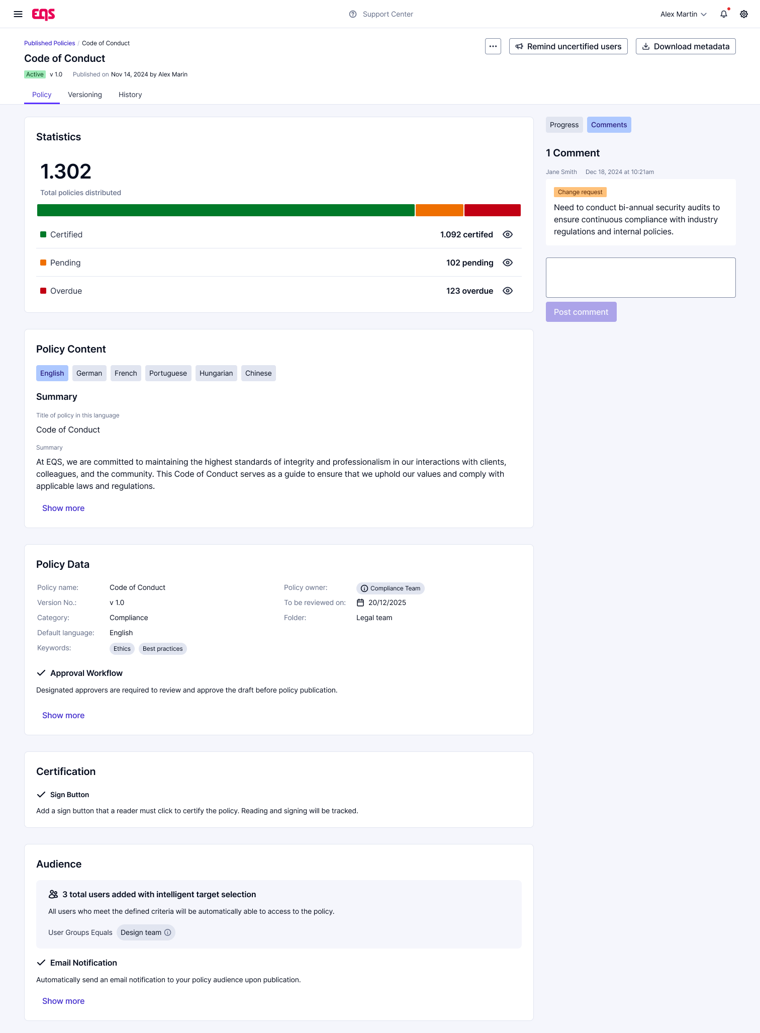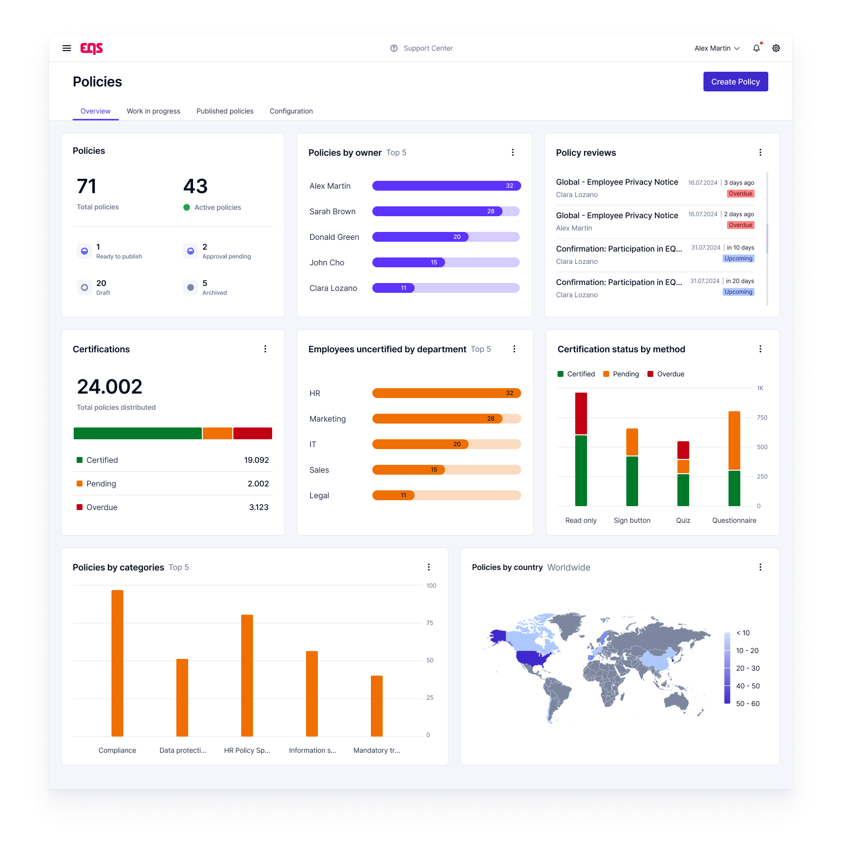 What I appreciate most about EQS Policies is how it centralizes compliance and policy management. The intuitive dashboards make it simple to monitor updates, maintain audit readiness, and provide teams with clear oversight across all branches. Review collected by and hosted on G2.com.