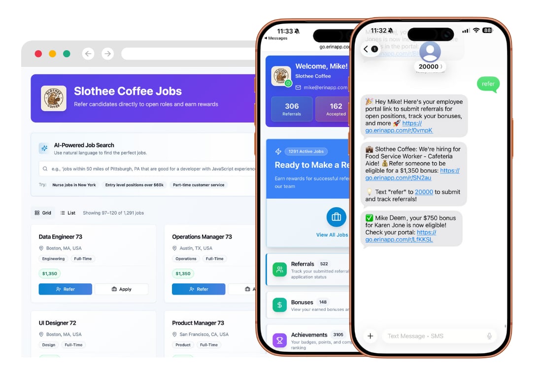 ERIN uses AI to identify the right employees to engage, recommend the right jobs to share, and automate personalized outreach through email and text. This drives higher participation, better candidate quality, and stronger conversion rates without increasing recruiter workload.