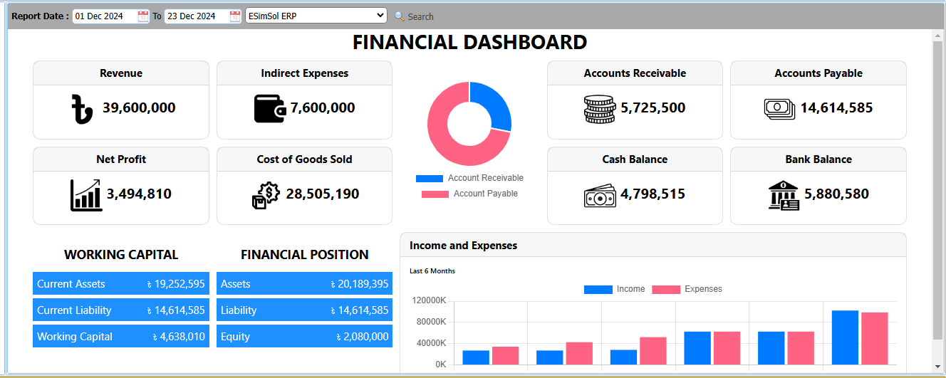 - Reporting and Analytics: Monitor financial health with interactive charts displaying sales, expenses, and employee performance metrics.