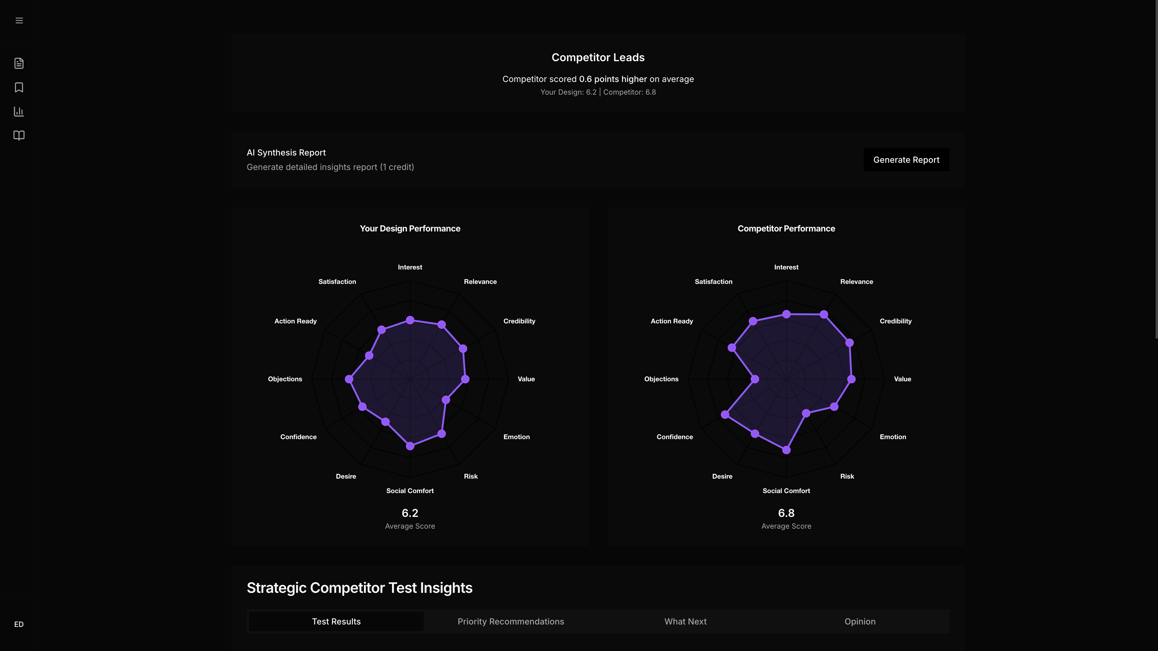 Teams use Evelance to evaluate designs, messaging, pricing, and competitive positioning across the product lifecycle. It helps surface hesitation, missed value, and decision blockers before they turn into costly mistakes.