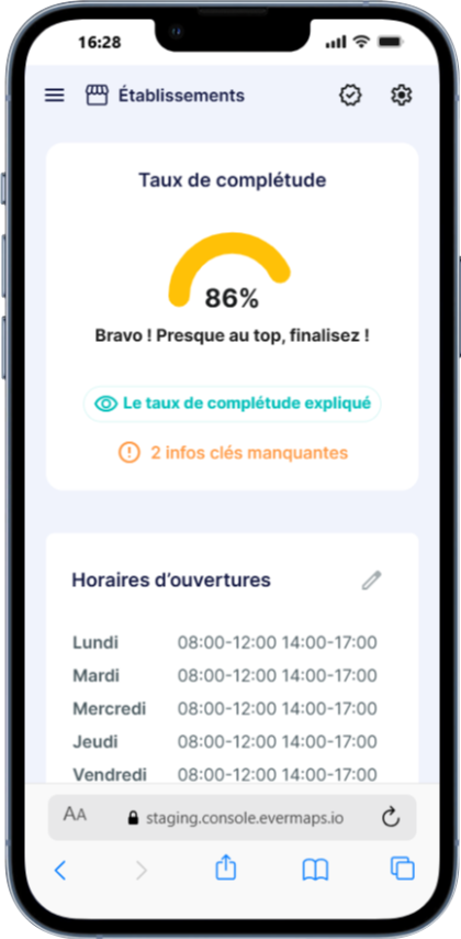 Opening hours, services, address, social networks, photos, custom data...