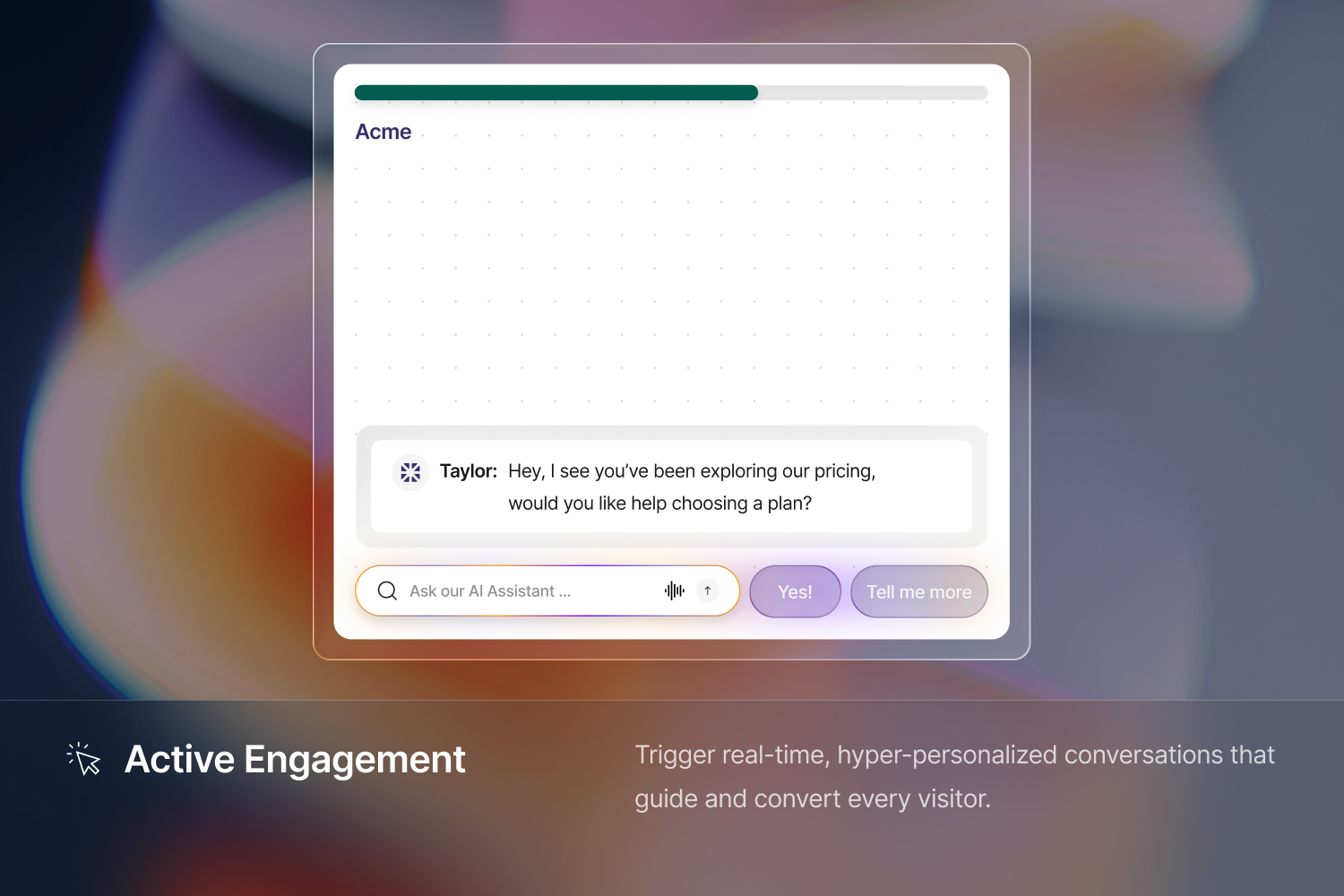 Expertise AI proactively engages every visitor with hyper-personalized microsites and AI-driven conversations, leveraging your own playbook, knowledge base, and CRM data. It qualifies each lead in real time, asks smart questions based on visitor actions, and enriches lead profiles with actionable firmographics and behavioural signals. No more missed opportunities, no more noisy leads.