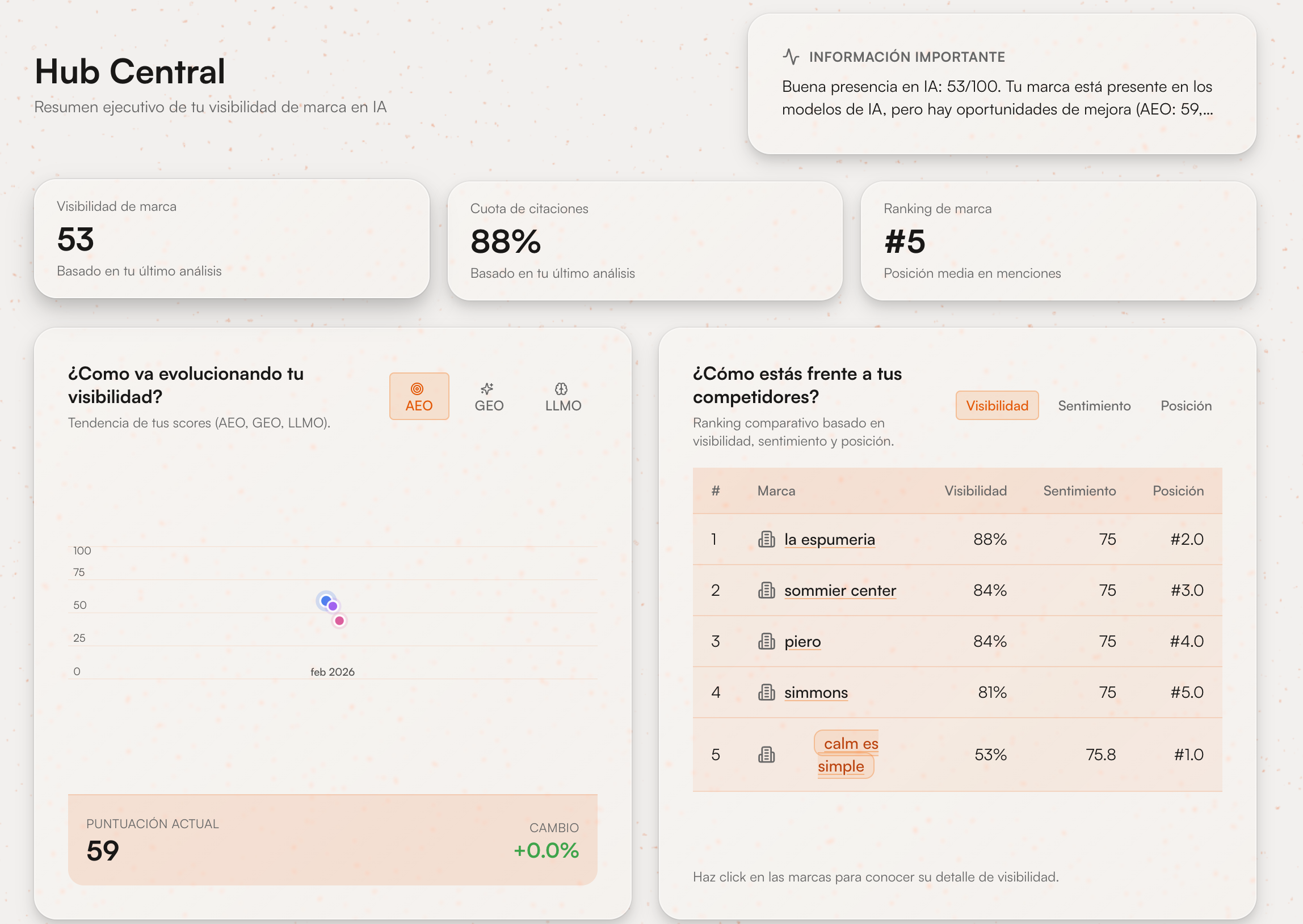 Clean dashboard with actionable metrics. The AI Visibility Score is easy to explain to execs, but the AEO/GEO/LLMO breakdowns let you dig deep when needed.