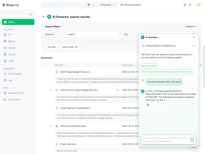 Wrapsody supports real-time synchronization, automatic backup, and version control, minimizing the risks of data loss and redundancy. Key features include AI-powered document summarization, semantic search, Q&A features, content-level access control, real-time content usage tracking, and ROT data management.