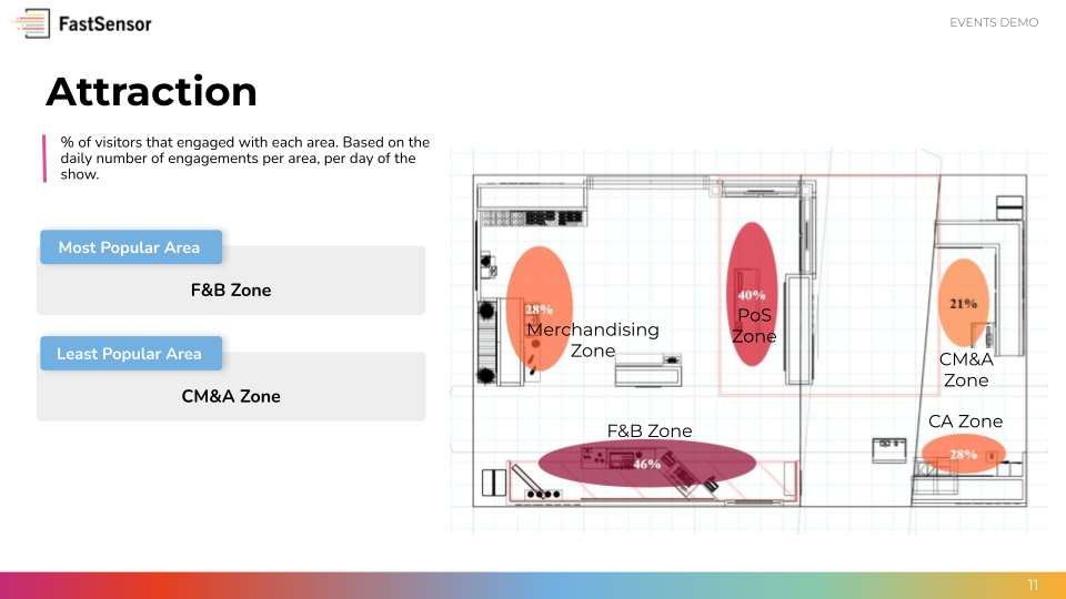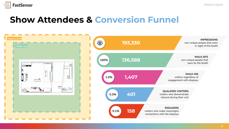 I mostly do small booths, so FastSensor is a bit of an expensive resource to use for some of my smaller booths. I found it more useful when we had the larger booths. I would love to be able to break down the movement outside the booth and the dwell times within the booth, like if the booth audience was stopping to watch a video or stopping at the counter to talk to a person or to read information at the reception counter. Review collected by and hosted on G2.com.