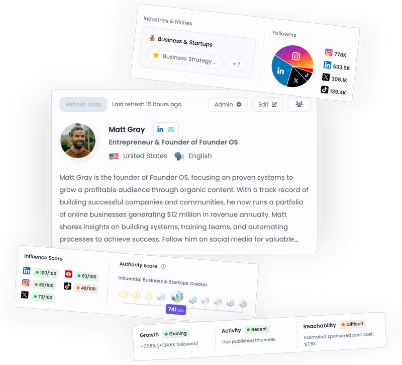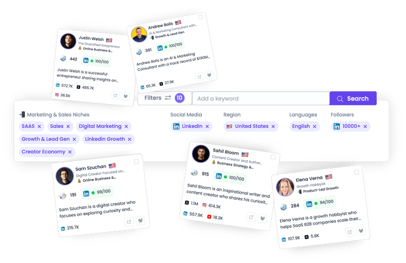 - Easily unlock the potential of social media to discover the perfect creators. Our filters empower you to target specific niches tailored to your needs or those of your clients.