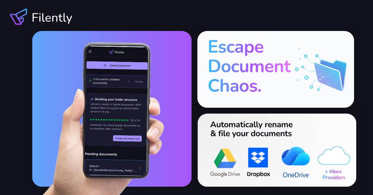 Filently is an AI-powered filing layer for Google Drive that automatically identifies, renames, and organizes your documents without any manual effort.