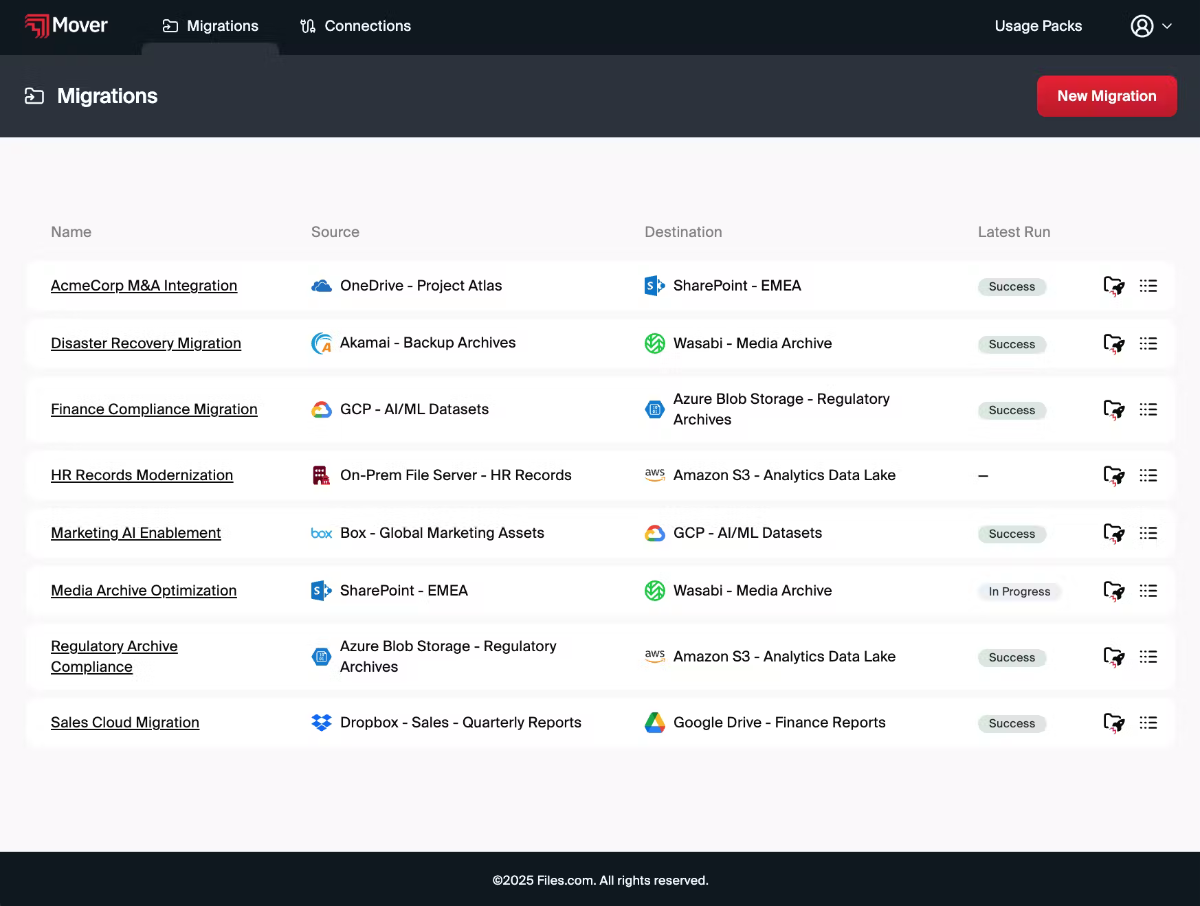 Mover by Files.com provides a secure and flexible way for data migration between on-premises systems, cloud services, and hybrid environments. It accommodates projects ranging from small transfers to large, complex migrations involving millions of files. Mover can handle high volumes of unstructured data while maintaining reliability and performance.