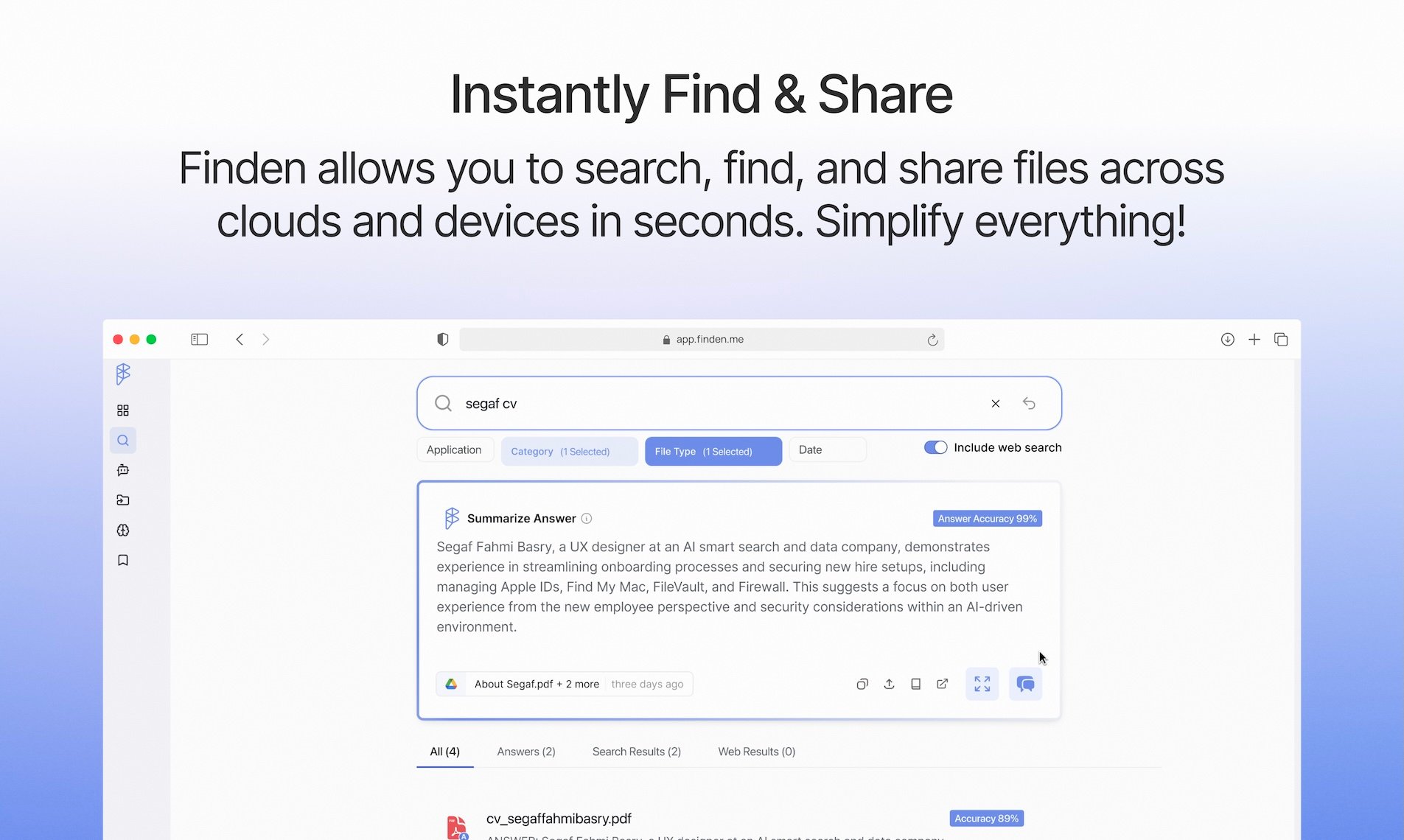 Running an agency means juggling multiple clients across different platforms—several email accounts, Slack, Google Drive, and more. Before Finden it felt impossible to keep track of everything. Now I can pull all of that into one place and search it instantly. The fact that I can also use ChatGPT on top of my own files is a game-changer - I can ask a question and get an answer that actually includes my emails, docs, and client history.