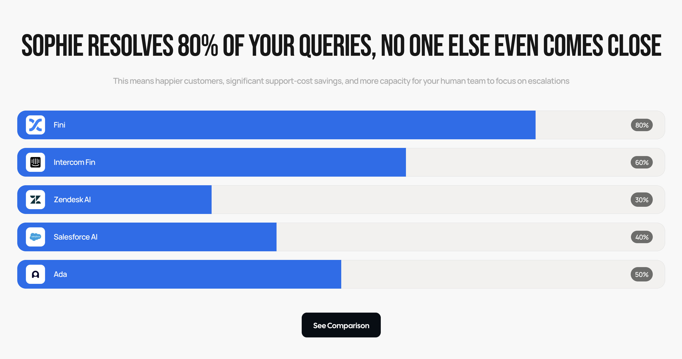Fini consistently delivers more accurate, higher-quality answers and handles more complex queries than any other AI agent. Fini comes with the industry’s most robust end-to-end capabilities, empowering teams to analyze, train, test, and deploy - all within a secure, no-code workspace designed for continuous quality improvement.