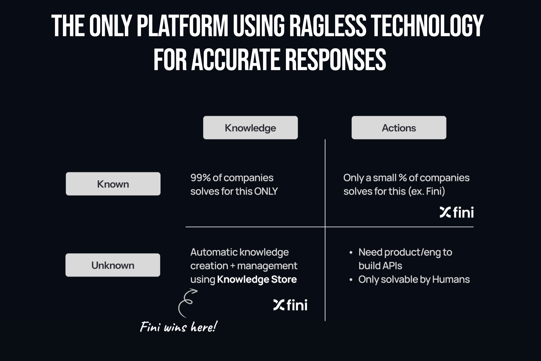 Fini is powered by the proprietary RAGless Retrieval Engine, a breakthrough RAGless architecture purpose-built for support automation. Every layer is optimized for precision, speed, security, and reliability, allowing Fini to autonomously resolve more conversations, across more channels, than competing AI agents.