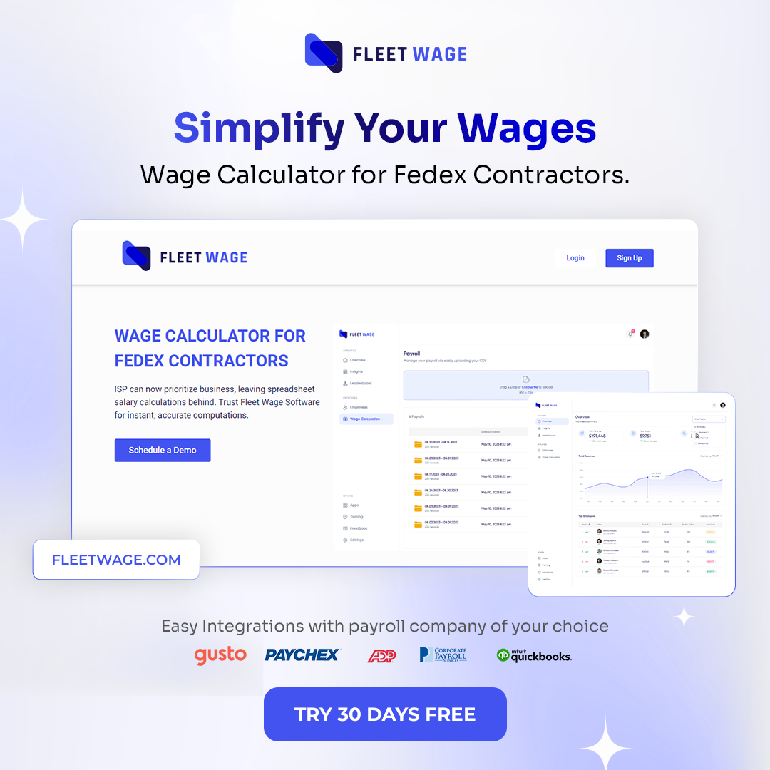 Trusted by FedEx contractors across the country, Fleet Wage empowers businesses to save time, reduce administrative burdens, and focus on profitability. By leveraging automation and real-time insights, Fleet Wage ensures payroll is processed quickly and accurately, allowing contractors to scale operations with confidence.